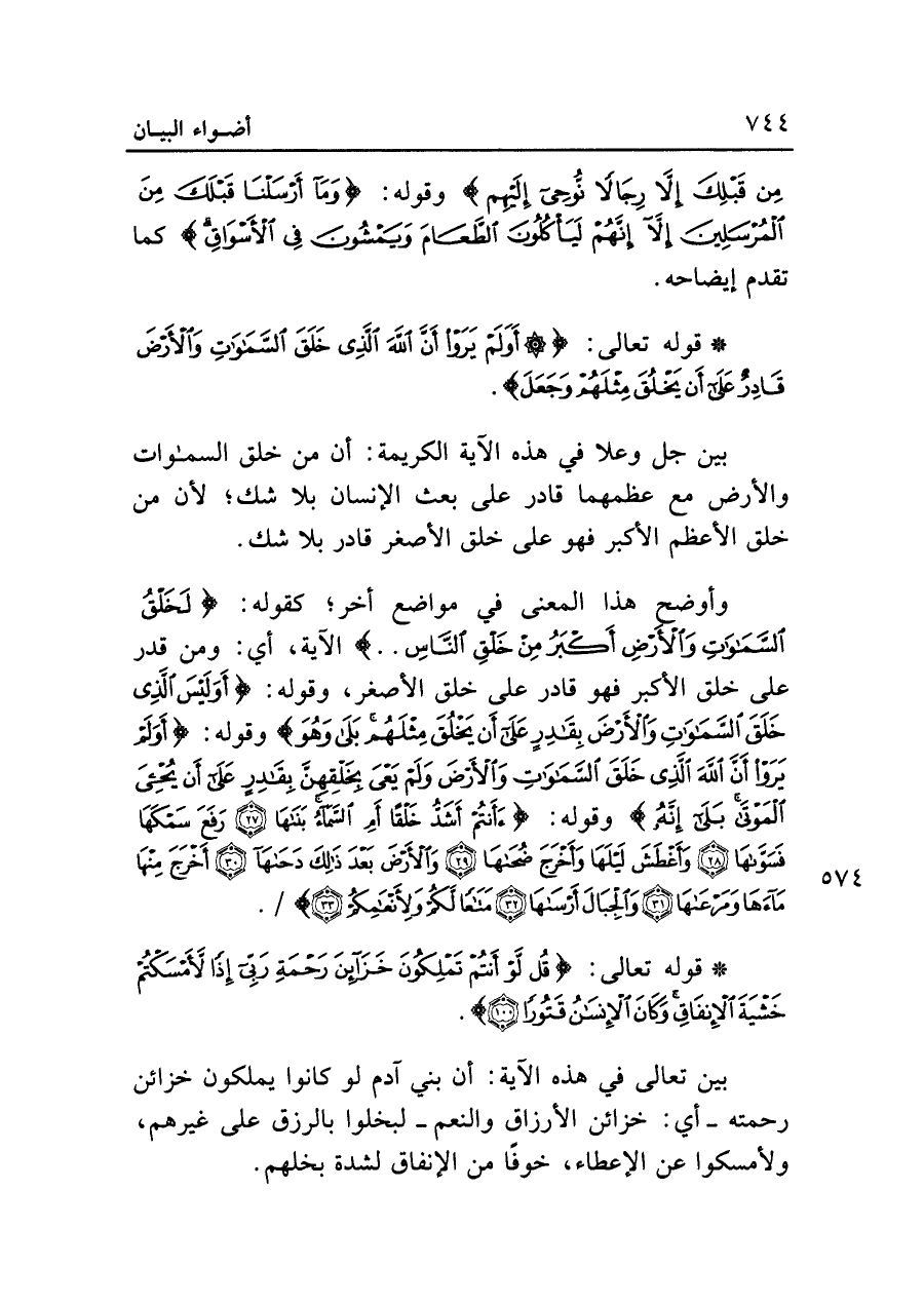 وأوضح هذا المعنى في مواضع أخر؛ كقوله: {لَخَلْقُ السَّمَاوَاتِ وَالْأَرْضِ أَكْبَرُ مِنْ خَلْقِ النَّاسِ .. } الآية، أي: ومن قدر على خلق الأكبر فهو قادر على خلق الأصغر، وقوله: {أَوَلَيْسَ الَّذِي خَلَقَ السَّمَاوَاتِ وَالْأَرْضَ بِقَادِرٍ عَلَى أَنْ يَخْلُقَ مِثْلَهُمْ بَلَى وَهُوَ} وقوله: {أَوَلَمْ يَرَوْا أَنَّ اللَّهَ الَّذِي خَلَقَ السَّمَاوَاتِ وَالْأَرْضَ وَلَمْ يَعْيَ بِخَلْقِهِنَّ بِقَادِرٍ عَلَى أَنْ يُحْيِيَ الْمَوْتَى بَلَى إِنَّهُ} وقوله: {أَأَنْتُمْ أَشَدُّ خَلْقًا أَمِ السَّمَاءُ بَنَاهَا (٢٧) رَفَعَ سَمْكَهَا فَسَوَّاهَا (٢٨) وَأَغْطَشَ لَيْلَهَا وَأَخْرَجَ ضُحَاهَا (٢٩) وَالْأَرْضَ بَعْدَ ذَلِكَ دَحَاهَا (٣٠) أَخْرَجَ مِنْهَا مَاءَهَا وَمَرْعَاهَا (٣١) وَالْجِبَالَ أَرْسَاهَا (٣٢) مَتَاعًا لَكُمْ وَلِأَنْعَامِكُمْ (٣٣)}.