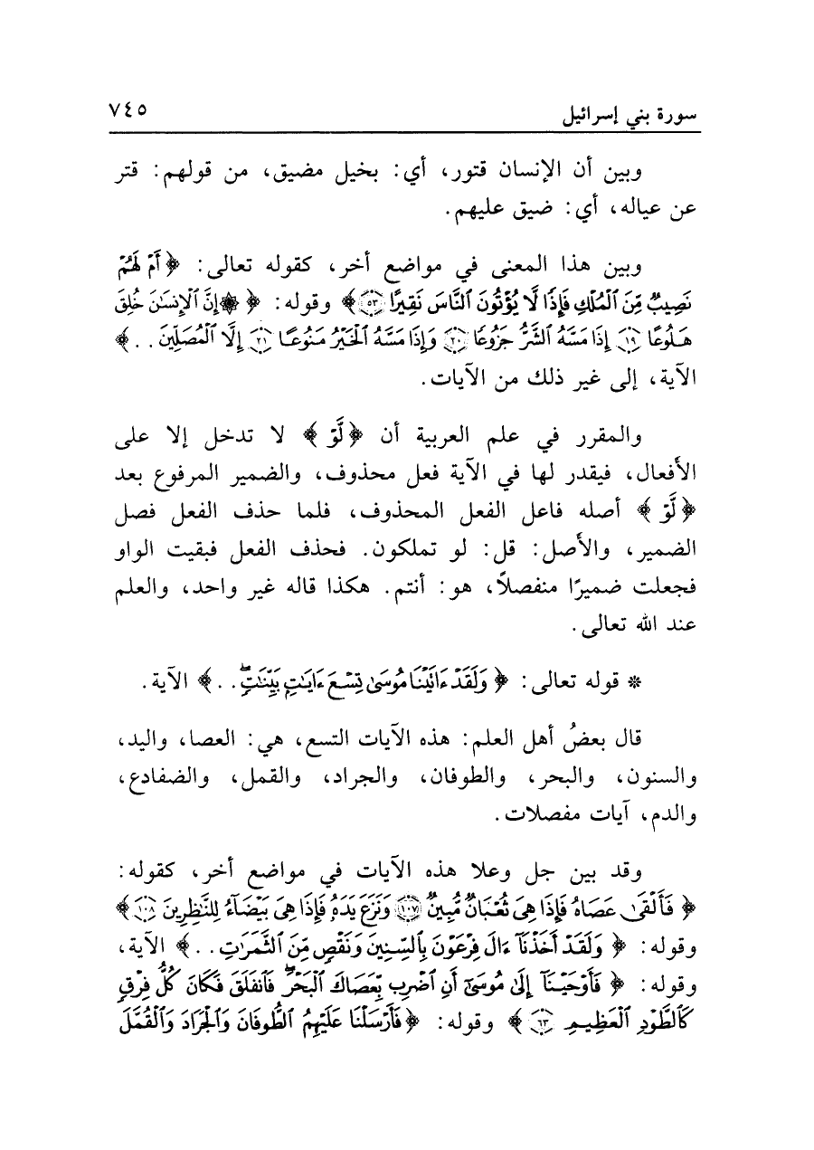 وبين هذا المعنى في مواضع أخر، كقوله تعالى: {أَمْ لَهُمْ نَصِيبٌ مِنَ الْمُلْكِ فَإِذًا لَا يُؤْتُونَ النَّاسَ نَقِيرًا (٥٣)} وقوله: {إِنَّ الْإِنْسَانَ خُلِقَ هَلُوعًا (١٩) إِذَا مَسَّهُ الشَّرُّ جَزُوعًا (٢٠) وَإِذَا مَسَّهُ الْخَيْرُ مَنُوعًا (٢١) إِلَّا الْمُصَلِّينَ .. } الآية، إلى غير ذلك من الآيات.