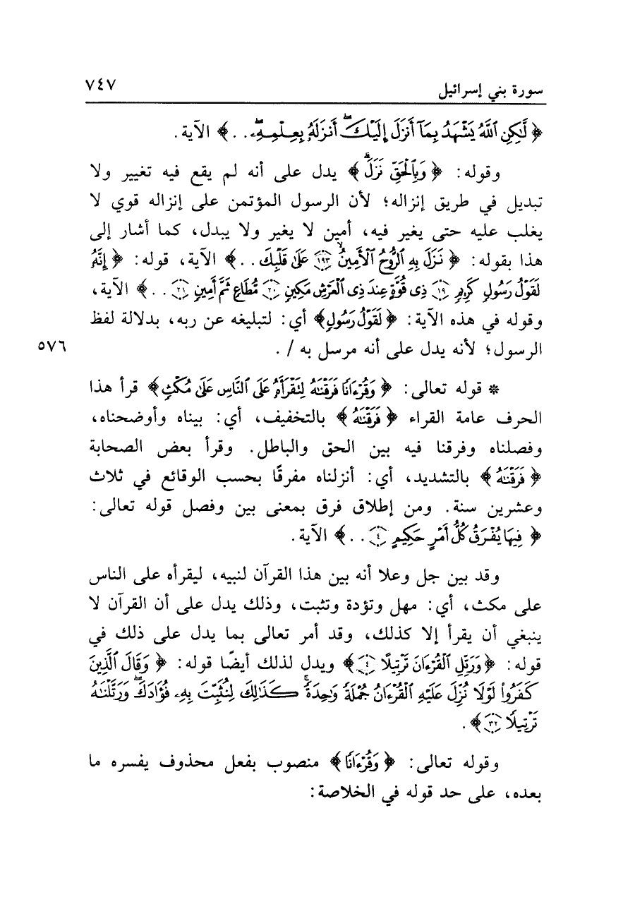 وقد بين جل وعلا أنه بين هذا القرآن لنبيه، ليقرأه على الناس على مكث، أي: مهل وتؤدة وتثبت، وذلك يدل على أن القرآن لا ينبغي أن يقرأ إلا كذلك، وقد أمر تعالى بما يدل على ذلك في قوله: {وَرَتِّلِ الْقُرْآنَ تَرْتِيلًا (٤)} ويدل لذلك أيضًا قوله: {وَقَالَ الَّذِينَ كَفَرُوا لَوْلَا نُزِّلَ عَلَيْهِ الْقُرْآنُ جُمْلَةً وَاحِدَةً كَذَلِكَ لِنُثَبِّتَ بِهِ فُؤَادَكَ وَرَتَّلْنَاهُ تَرْتِيلًا (٣٢)}.