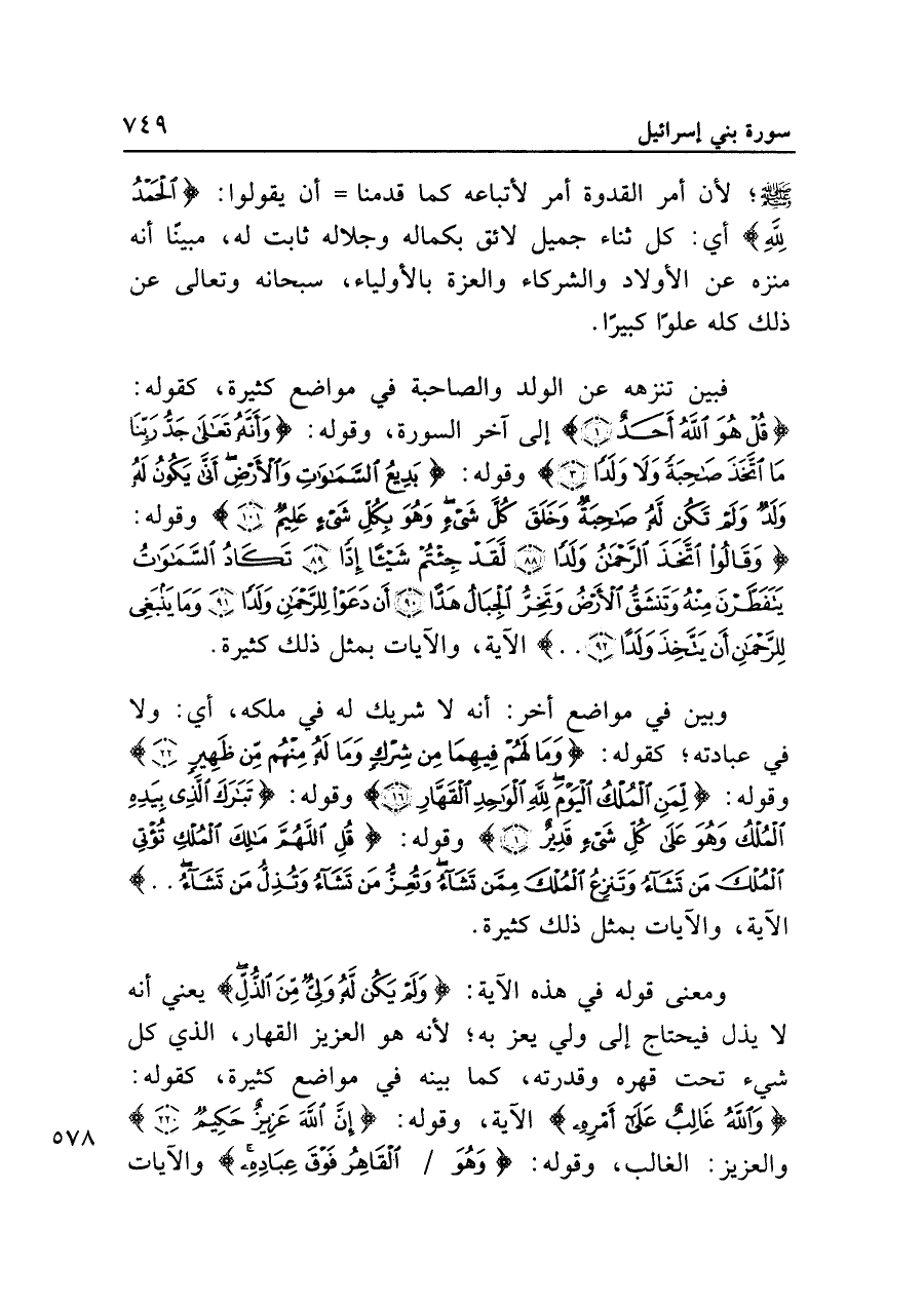 ومعنى قوله في هذه الآية: {وَلَمْ يَكُنْ لَهُ وَلِيٌّ مِنَ الذُّلِّ} يعني أنه لا يذل فيحتاج إلى ولي يعز به؛ لأنه هو العزيز القهار، الذي كل شيء تحت قهره وقدرته، كما بينه في مواضع كثيرة، كقوله: {وَاللَّهُ غَالِبٌ عَلَى أَمْرِهِ} الآية، وقوله {إِنَّ اللَّهَ عَزِيزٌ حَكِيمٌ (٢٢٠)} والعزيز: الغالب، وقوله: {وَهُوَ الْقَاهِرُ فَوْقَ عِبَادِهِ} والآيات