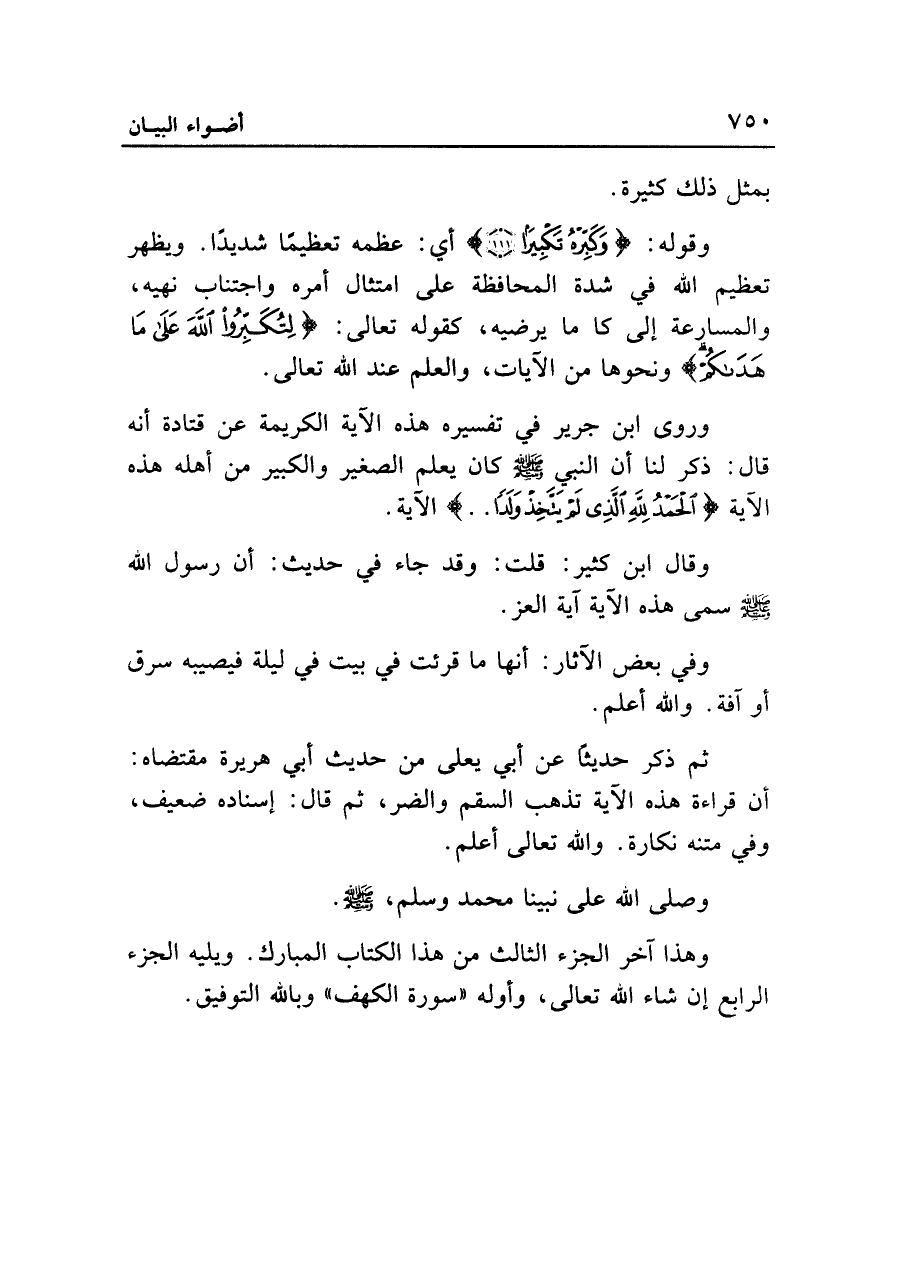 وهذا آخر الجزء الثالث من هذا الكتاب المبارك. ويليه الجزء الرابع إن شاء الله تعالى، وأوله "سورة الكهف" وبالله التوفيق.