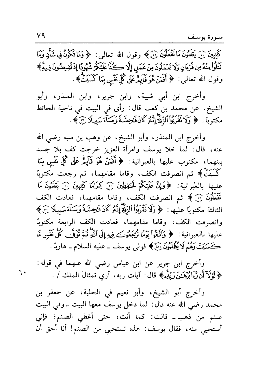 وأخرج ابن المنذر، وأبو الشيخ، عن وهب بن منبه رضي الله عنه، قال: لما خلا يوسف وامرأة العِزيز خرجت كف بلا جسد بينهما، مكتوب عليها بالعبرانية: {أَفَمَنْ هُوَ قَائِمٌ عَلَى كُلِّ نَفْسٍ بِمَا كَسَبَتْ} ثم انصرفت الكف، وقاما مقامهما، ثم رجعت مكتوبًا عليها بالعبرانية: {وَإِنَّ عَلَيْكُمْ لَحَافِظِينَ (١٠) كِرَامًا كَاتِبِينَ (١١) يَعْلَمُونَ مَا تَفْعَلُونَ (١٢)} ثم انصرفت الكف، وقاما مقامهما، فعادت الكف الثالثة مكتوبًا عليها: {وَلَا تَقْرَبُوا الزِّنَى إِنَّهُ كَانَ فَاحِشَةً وَسَاءَ سَبِيلًا (٣٢) وانصرفت الكف، وقاما مقامهما، فعادت الكف الرابعة مكتوبًا عليها بالعبرانية: {وَاتَّقُوا يَوْمًا تُرْجَعُونَ فِيهِ إِلَى اللَّهِ ثُمَّ تُوَفَّى كُلُّ نَفْسٍ مَا كَسَبَتْ وَهُمْ لَا يُظْلَمُونَ (٢٨١)} فولى يوسف -عليه السلام- هاربًا.