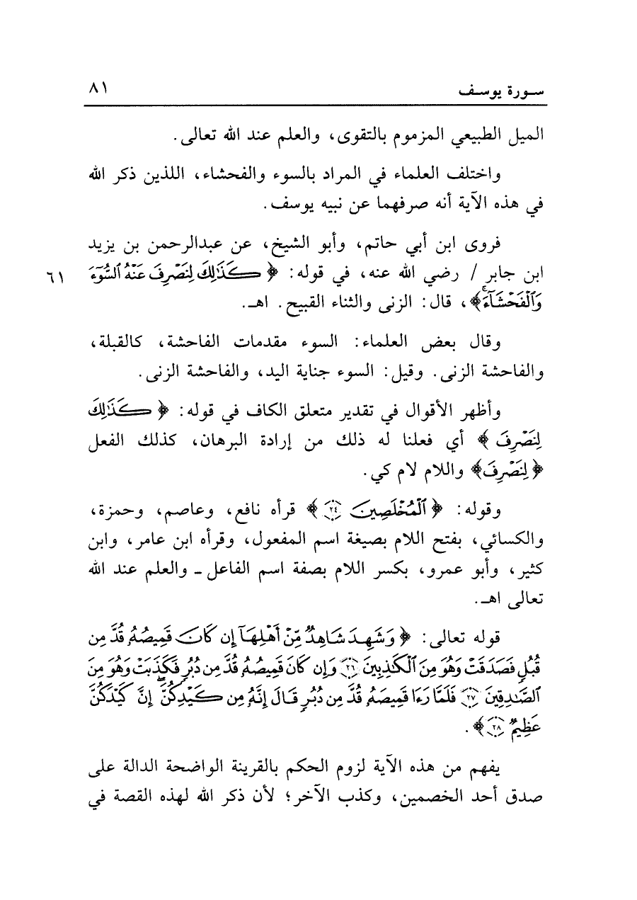 فروى ابن أبي حاتم، وأبو الشيخ، عن عبد الرحمن بن يزيد ابن جابر رضي الله عنه، في قوله: {كَذَلِكَ لِنَصْرِفَ عَنْهُ السُّوءَ وَالْفَحْشَاءَ}، قال: الزنى والثناء القبيح. اه.