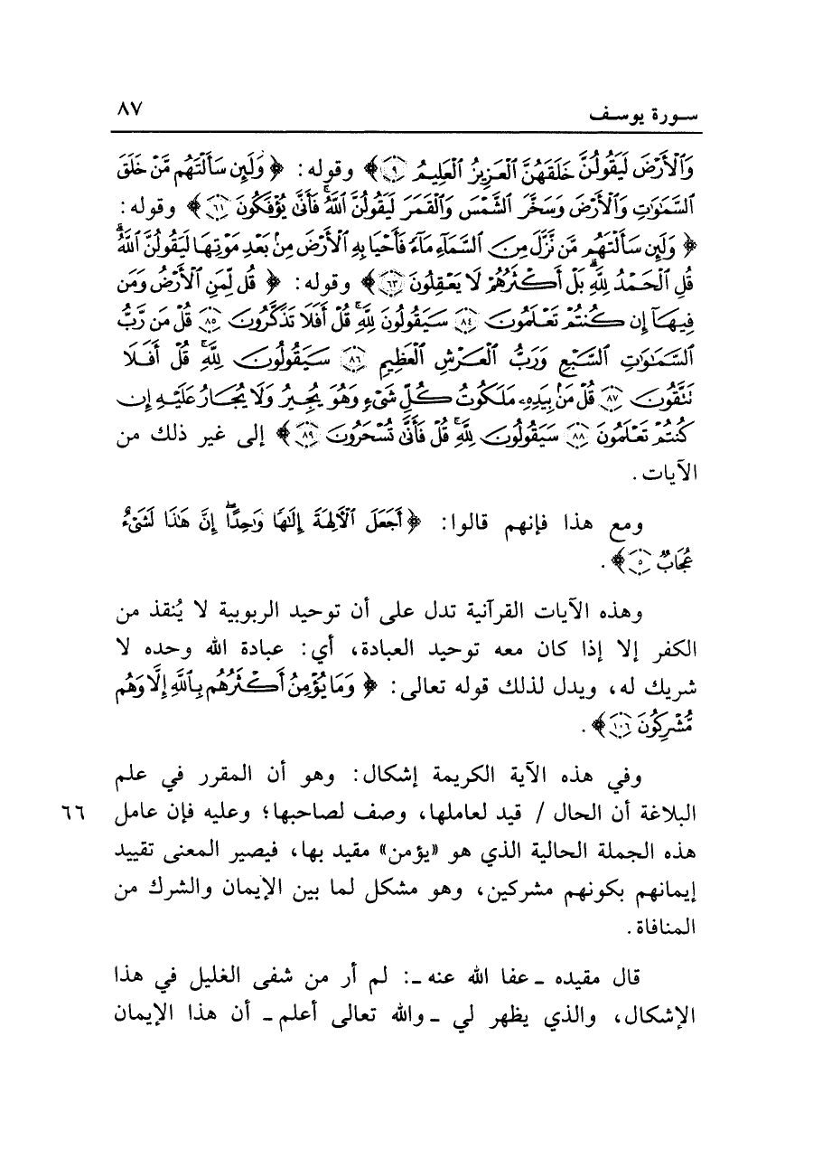 وفي هذه الآية الكريمة إشكال: وهو أن المقرر في علم البلاغة أن الحال قيد لعاملها، وصف لصاحبها؛ وعليه فإن عامل هذه الجملة الحالية الذي هو "يؤمن" مقيد بها، فيصير المعنى تقييد إيمانهم بكونهم مشركين، وهو مشكل لما بين الإيمان والشرك من المنافاة.
