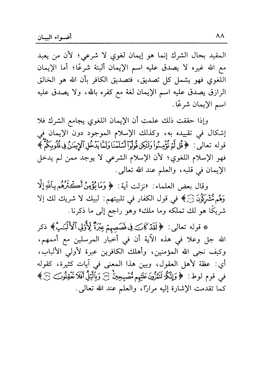 وإذا حققت ذلك علمت أن الإيمان اللغوي يجامع الشرك فلا إشكال في تقييده به، وكذلك الإسلام الموجود دون الإيمان في قوله تعالى: {قُلْ لَمْ تُؤْمِنُوا وَلَكِنْ قُولُوا أَسْلَمْنَا وَلَمَّا يَدْخُلِ الْإِيمَانُ فِي قُلُوبِكُمْ} فهو الإسلام اللغوي؛ لأن الإسلام الشرعي لا يوجد ممن لم يدخل الإيمان في قلبه، والعلم عند الله تعالى.