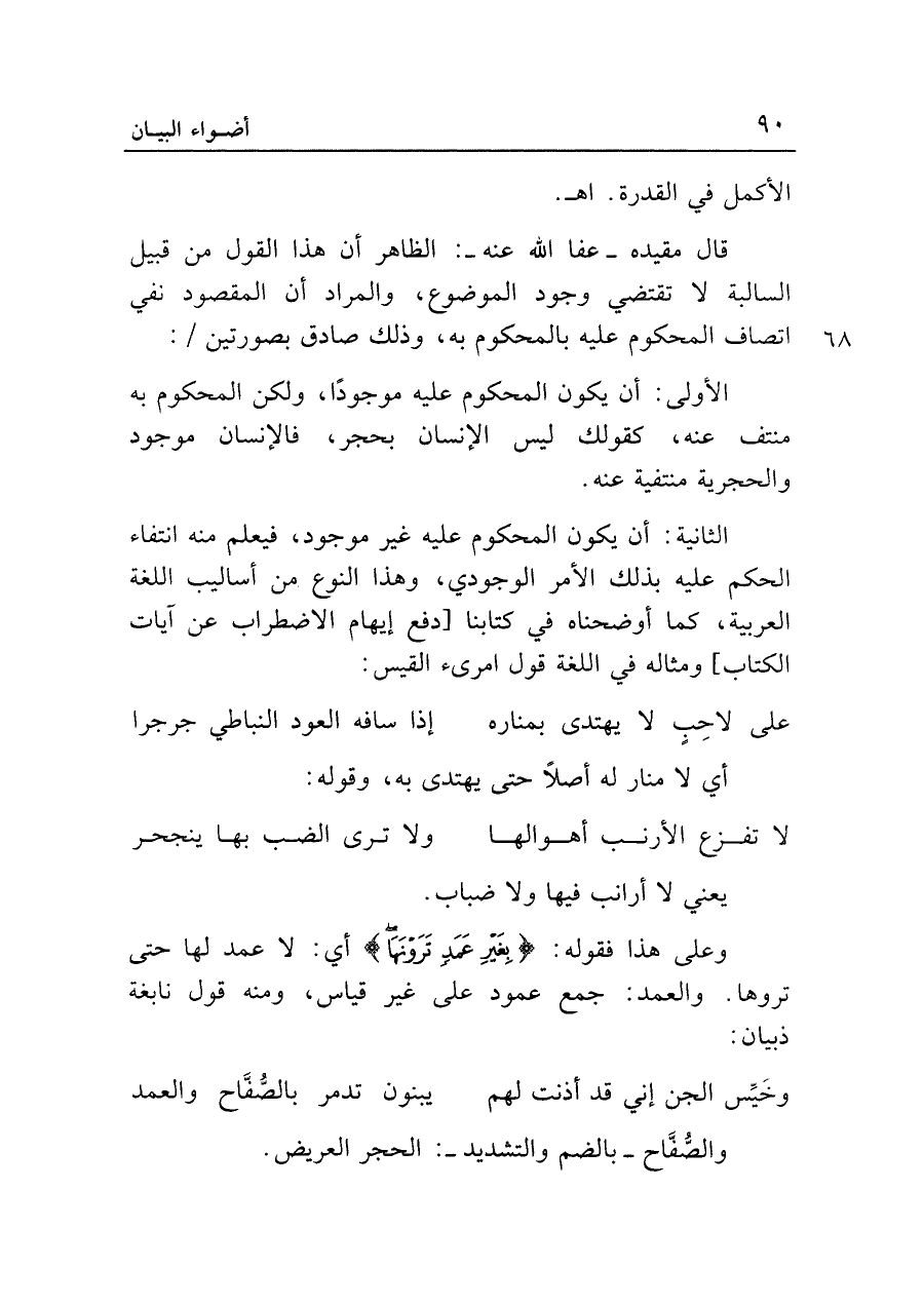 قال مقيده -عفا الله عنه-: الظاهر أن هذا القول من قبيل السالبة لا تقتضي وجود الموضوع، والمراد أن المقصود نفي اتصاف المحكوم عليه بالمحكوم به، وذلك صادق بصورتين: