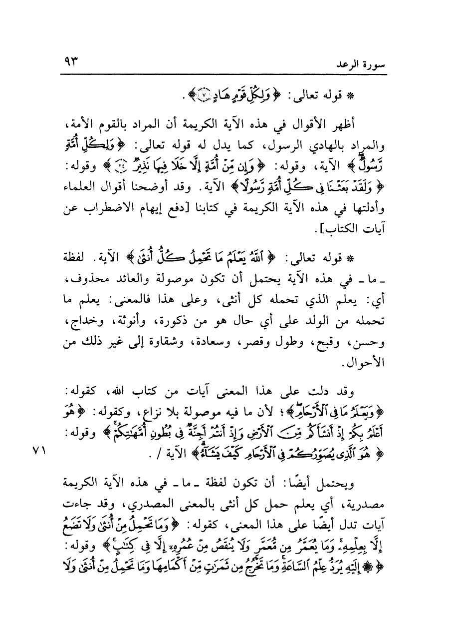 أظهر الأقوال في هذه الآية الكريمة أن المراد بالقوم الأمة، والمراد بالهادي الرسول، كما يدل له قوله تعالى: {وَلِكُلِّ أُمَّةٍ رَسُولٌ} الآية، وقوله: {وَإِنْ مِنْ أُمَّةٍ إِلَّا خَلَا فِيهَا نَذِيرٌ (٢٤)} وقوله: {وَلَقَدْ بَعَثْنَا فِي كُلِّ أُمَّةٍ رَسُولًا} الآية. وقد أوضحنا أقوال العلماء وأدلتها في هذه الآية الكريمة في كتابنا [دفع إيهام الاضطراب عن آيات الكتاب].