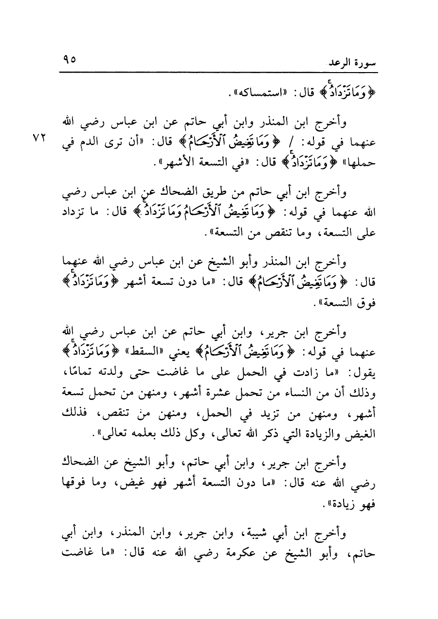 وأخرج ابن أبي حاتم من طريق الضحاك عن ابن عباس رضي الله عنهما في قوله: {وَمَا تَغِيضُ الْأَرْحَامُ وَمَا تَزْدَادُ} قال: ما تزداد على التسعة، وما تنقص من التسعة".