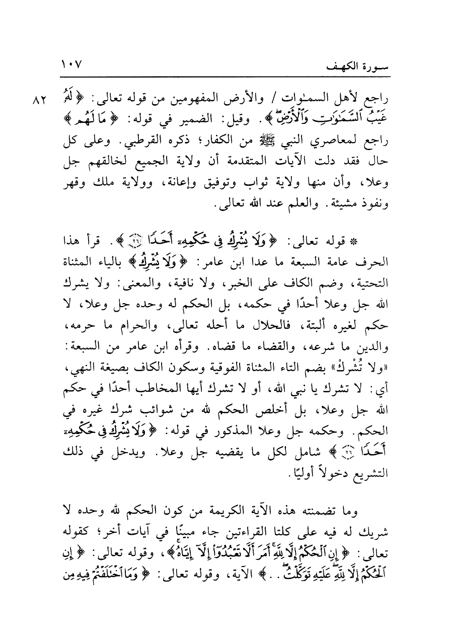 • قوله تعالى: {وَلَا يُشْرِكُ فِي حُكْمِهِ أَحَدًا (٢٦)}. قرأ هذا الحرف عامة السبعة ما عدا ابن عامر: {وَلَا يُشْرِكُ} بالياء المثناة التحتية، وضم الكاف على الخبر، ولا نافية، والمعنى: ولا يشرك الله جل وعلا أحدًا في حكمه، بل الحكم له وحده جل وعلا، لا حكم لغيره ألبتة، فالحلال ما أحله تعالى، والحرام ما حرمه، والدين ما شرعه، والقضاء ما قضاه. وقرأه ابن عامر من السبعة: "ولا تُشْركْ" بضم التاء المثناة الفوقية وسكون الكاف بصيغة النَّهي، أي: لا تشرك يا نبي الله، أو لا تشرك أيها المخاطب أحدًا في حكم الله جل وعلا، بل أخلص الحكم لله من شوائب شرك غيره في الحكم. وحكمه جل وعلا المذكور في قوله: {وَلَا يُشْرِكُ فِي حُكْمِهِ أَحَدًا (٢٦)} شامل لكل ما يقضيه جل وعلا. ويدخل في ذلك التّشريع دخولًا أوليًا.