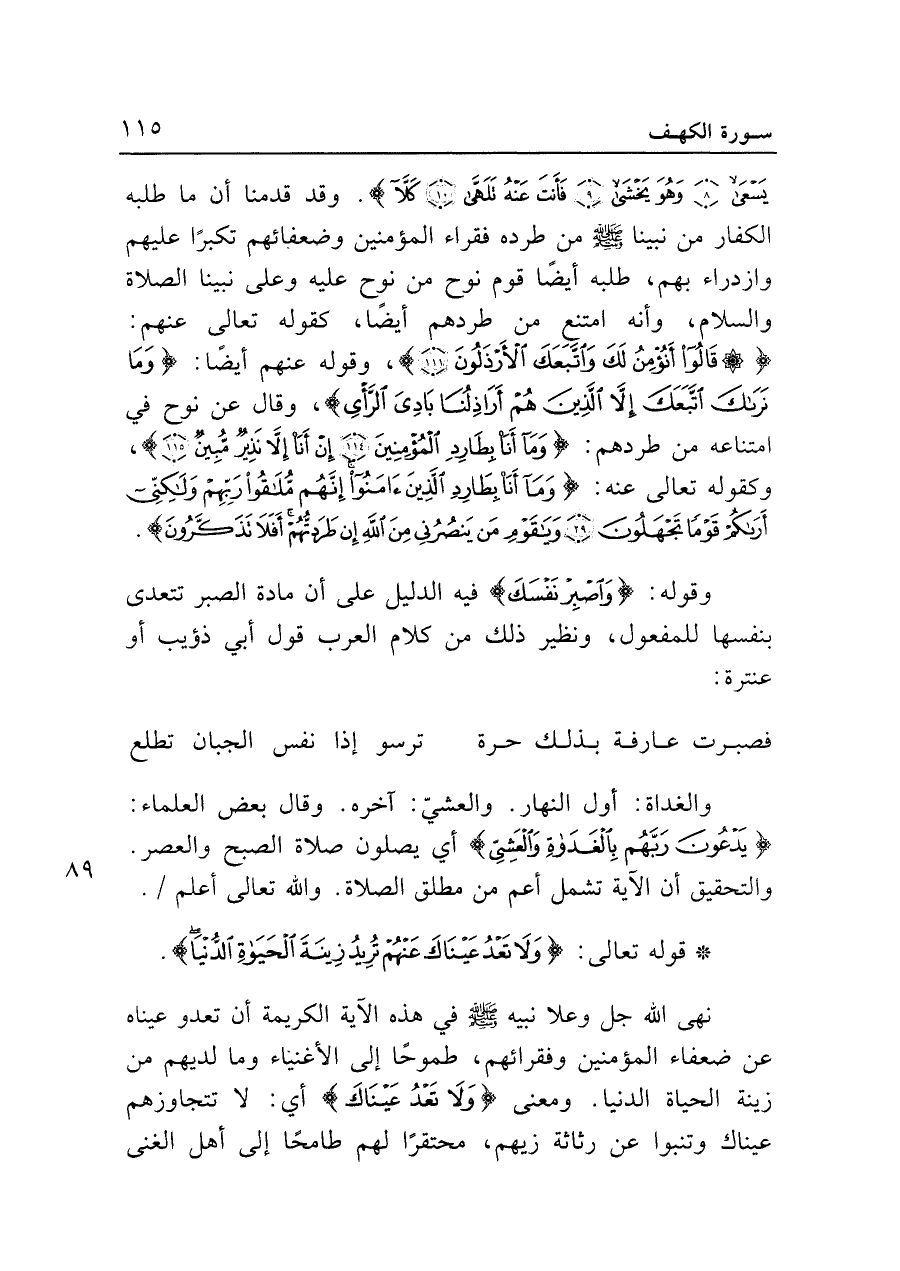وقوله: {وَاصْبِرْ نَفْسَكَ} فيه الدليل على أن مادة الصبر تتعدى بنفسها للمفعول، ونظير ذلك من كلام العرب قول أبي ذؤيب أو عنترة: