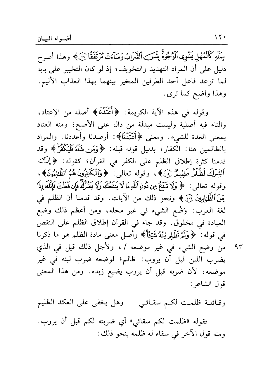 وقوله في هذه الآية الكريمة: {أَعْتَدْنَا} أصله من الإعتاد، والتاء فيه أصلية وليست مبدلة من دال على الأصح؛ ومنه العتاد بمعنى العدة للشيء. ومعنى {أَعْتَدْنَا}: أرصدنا وأعددنا. والمراد بالظالمين هنا: الكفار؛ بدليل قوله قبله: {وَمَنْ شَاءَ فَلْيَكْفُرْ} وقد قدمنا كثرة إطلاق الظلم على الكفر في القرآن؛ كقوله: {إِنَّ الشِّرْكَ لَظُلْمٌ عَظِيمٌ (١٣)} ، وقوله تعالى: {وَالْكَافِرُونَ هُمُ الظَّالِمُونَ (٢٥٤)} وقوله تعالى: {وَلَا تَدْعُ مِنْ دُونِ اللَّهِ مَا لَا يَنْفَعُكَ وَلَا يَضُرُّكَ فَإِنْ فَعَلْتَ فَإِنَّكَ إِذًا مِنَ الظَّالِمِينَ (١٠٦)} ونحو ذلك من الآيات. وقد قدمنا أن الظلم في لغة العرب: وَضْع الشيء في غير محله، ومن أعظم ذلك وضع العبادة في مخلوق. وقد جاء في القرآن إطلاق الظلم على النقص في قوله: {وَلَمْ تَظْلِمْ مِنْهُ شَيئًا} وأصل معنى مادة الظلم هو ما ذكرنا من وضع الشيء في غير موضعه، ولأجل ذلك قيل في الذي يضرب اللبن قبل أن يروب: ظالم؛ لوضعه ضرب لبنه في غير موضعه، لأن ضربه قبل أن يروب يضيع زبده. ومن هذا المعنى قول الشاعر: