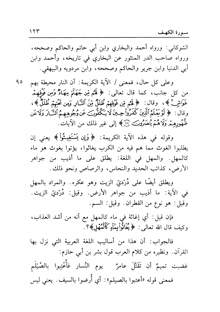 وقوله في هذه الآية الكريمة: {وَإِنْ يَسْتَغِيثُوا} يعني إن يطلبوا الغوث مما هم فيه من الكرب يغاثوا، يؤتوا بغوث هو ماء كالمهل. والمهل في اللغة: يطلق على ما أذيب من جواهر الأرض، كذائب الحديد والنحاس، والرصاص ونحو ذلك.