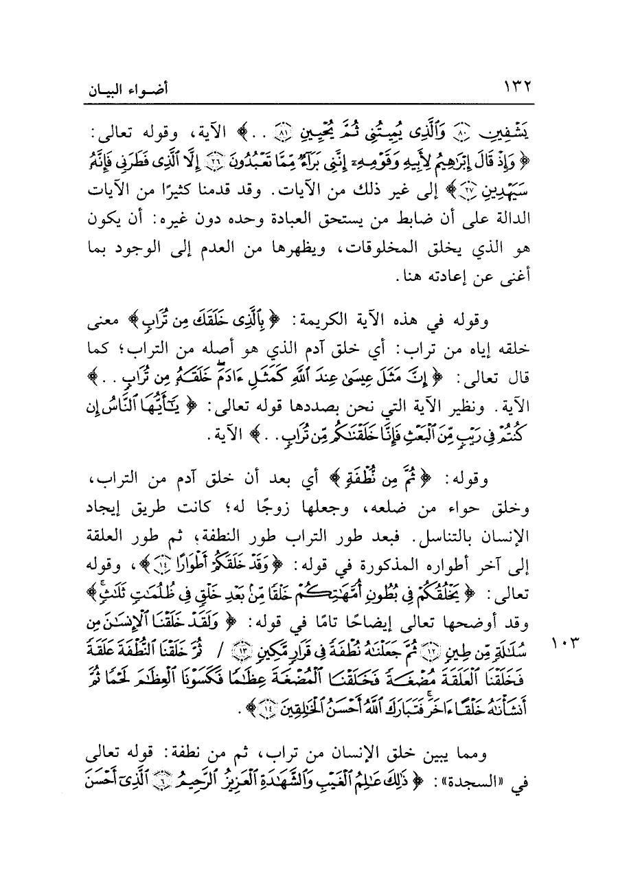 ومما يبين خلق الإنسان من تراب، ثم من نطفة: قوله تعالى في "السجدة": {ذَلِكَ عَالِمُ الْغَيبِ وَالشَّهَادَةِ الْعَزِيزُ الرَّحِيمُ (٦) الَّذِي أَحْسَنَ