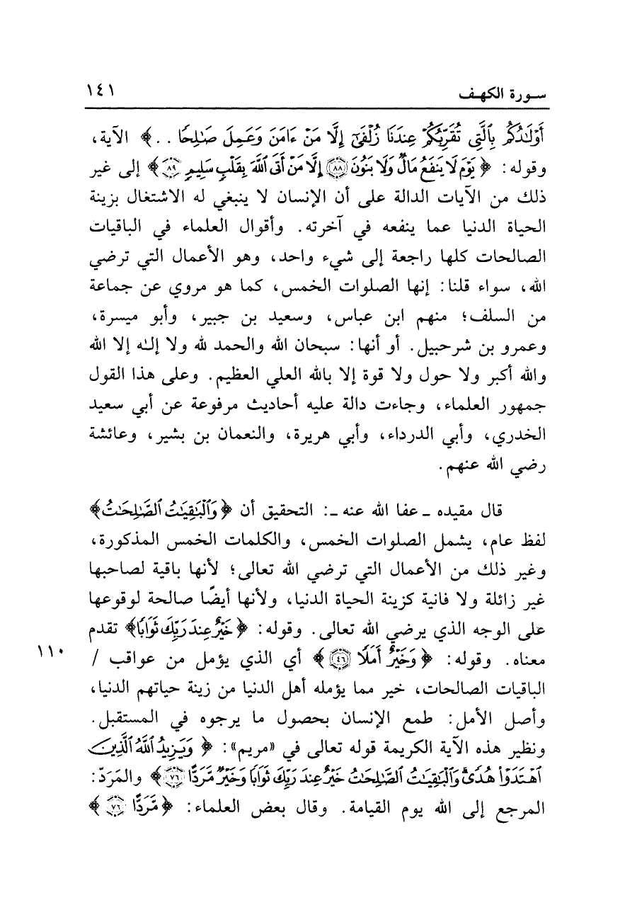أَوْلَادُكُمْ بِالَّتِي تُقَرِّبُكُمْ عِنْدَنَا زُلْفَى إلا مَنْ آمَنَ وَعَمِلَ صَالِحًا .. } الآية، وقوله: {يَوْمَ لَا يَنْفَعُ مَالٌ وَلَا بَنُونَ (٨٨) إلا مَنْ أَتَى اللَّهَ بِقَلْبٍ سَلِيمٍ (٨٩)} إلى غير ذلك من الآيات الدالة على أن الإنسان لا ينبغي له الاشتغال بزينة الحياة الدنيا عما ينفعه في آخرته. وأقوال العلماء في الباقيات الصالحات كلها راجعة إلى شيء واحد، وهو الأعمال التي ترضي الله، سواء قلنا: إنها الصلوات الخمس، كما هو مروي عن جماعة من السلف؛ منهم ابن عباس، وسعيد بن جبير، وأبو ميسرة، وعمرو بن شرحبيل. أو أنها: سبحان الله والحمد لله ولا إله إلا الله والله أكبر ولا حول ولا قوة إلا بالله العلي العظيم. وعلى هذا القول جمهور العلماء، وجاءت دالة عليه أحاديث مرفوعة عن أبي سعيد الخدري، وأبي الدرداء، وأبي هريرة، والنعمان بن بشير، وعائشة رضي الله عنهم.