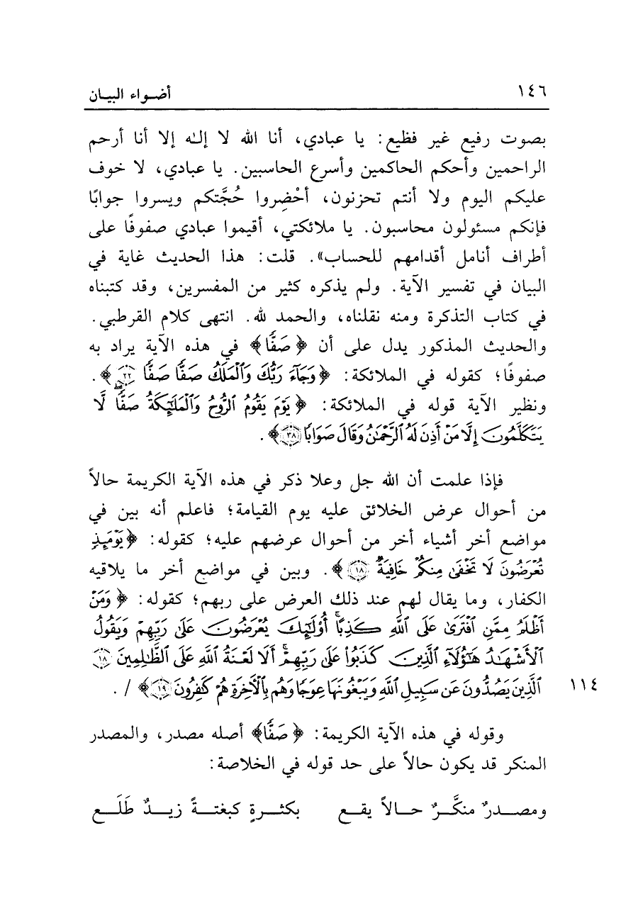 بصوت رفيع غير فظيع: يا عبادي، أنا الله لا إله إلا أنا أرحم الراحمين وأحكم الحاكمين وأسرع الحاسبين. يا عبادي، لا خوف عليكم اليوم ولا أنتم تحزنون، أحْضِروا حُجَّتكم ويسروا جوابًا فإنكم مسئولون محاسبون. يا ملائكتي، أقيموا عبادي صفوفًا على أطراف أنامل أقدامهم للحساب". قلت: هذا الحديث غاية في البيان في تفسير الآية. ولم يذكره كثير من المفسرين، وقد كتبناه في كتاب التذكرة ومنه نقلناه، والحمد لله. انتهى كلام القرطبي. والحديث المذكور يدل على أن {صَفًّا} في هذه الآية يراد به صفوفًا؛ كقوله في الملائكة: {وَجَاءَ رَبُّكَ وَالْمَلَكُ صَفًّا صَفًّا (٢٢)} . ونظير الآية قوله في الملائكة: {يَوْمَ يَقُومُ الرُّوحُ وَالْمَلَائِكَةُ صَفًّا لَا يَتَكَلَّمُونَ إلا مَنْ أَذِنَ لَهُ الرَّحْمَنُ وَقَال صَوَابًا (٣٨)} .