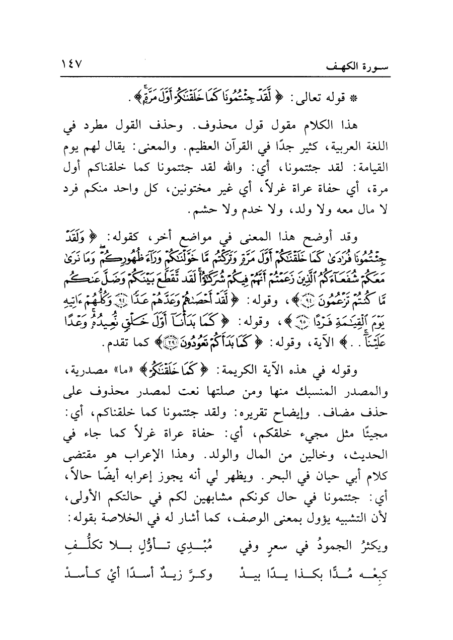 وقوله في هذه الآية الكريمة: {كَمَا خَلَقْنَاكُمْ} "ما" مصدرية، والمصدر المنسبك منها ومن صلتها نعت لمصدر محذوف على حذف مضاف. وإيضاح تقريره: ولقد جئتمونا كما خلقناكم، أي: مجيئا مثل مجيء خلقكم، أي: حفاة عراة غرلا كما جاء في الحديث، وخالين من المال والولد. وهذا الإعراب هو مقتضى كلام أبي حيان في البحر. ويظهر لي أنه يجوز إعرابه أيضًا حالًا، أي: جئتمونا في حال كونكم مشابهين لكم في حالتكم الأولى، لأن التشبيه يؤول بمعنى الوصف، كما أشار له في الخلاصة بقوله: