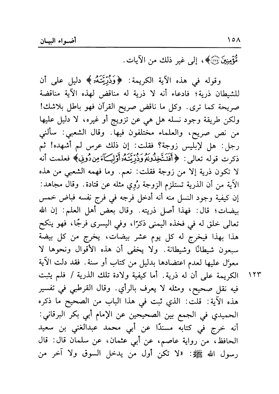 وقوله في هذه الآية الكريمة: {وَذُرِّيَّتَهُ} دليل على أن للشيطان ذرية؛ فادعاء أنه لا ذرية له مناقض لهذه الآية مناقضة صريحة كما ترى. وكل ما ناقض صريح القرآن فهو باطل بلا شك! ولكن طريقة وجود نسله هل هي عن تزويج أو غيره، لا دليل عليها من نص صريح، والعلماء مختلفون فيها. وقال الشعبي: سألني رجل: هل لإبليس زوجة؟ فقلت: إن ذلك عرس لم أشهده! ثم ذكرت قوله تعالى: {أَفَتَتَّخِذُونَهُ وَذُرِّيَّتَهُ أَوْلِيَاءَ مِنْ دُونِي} فعلمت أنه لا تكون ذرية إلا من زوجة فقلت: نعم. وما فهمه الشعبي من هذه الآية من أن الذرية تستلزم الزوجة رُوي مثله عن قتادة. وقال مجاهد: إن كيفية وجود النسل منه أنه أدخل فرجه في فرج نفسه فباض خمس بيضات؛ قال: فهذا أصل ذريته. وقال بعض أهل العلم: إن الله تعالى خلق له في فخذه اليمنى ذكرًا، وفي اليسرى فرجًا، فهو ينكح هذا بهذا فيخرج له كل يوم عشر بيضات، يخرج من كل بيضة سبعون شيطانًا وشيطانة. ولا يخفى أن هذه الأقوال ونحوها لا معوَّل عليها لعدم اعتضادها بدليل من كتاب أو سنة. فقد دلت الآية الكريمة على أن له ذرية. أما كيفية ولادة تلك الذرية فلم يثبت فيه نقل صحيح، ومثله لا يعرف بالرأي. وقال القرطبي في تفسير هذه الآية: قلت: الذي ثبت في هذا الباب من الصحيح ما ذكره الحميدي في الجمع بين الصحيحين عن الإمام أبي بكر البرقاني: أنَّه خرج في كتابه مسندًا عن أبي محمد عبد الغني بن سعيد الحافظ، من رواية عاصم، عن أبي عثمان، عن سلمان قال: قال رسول الله - صلى الله عليه وسلم -: "لا تكن أول من يدخل السوق ولا آخر من
