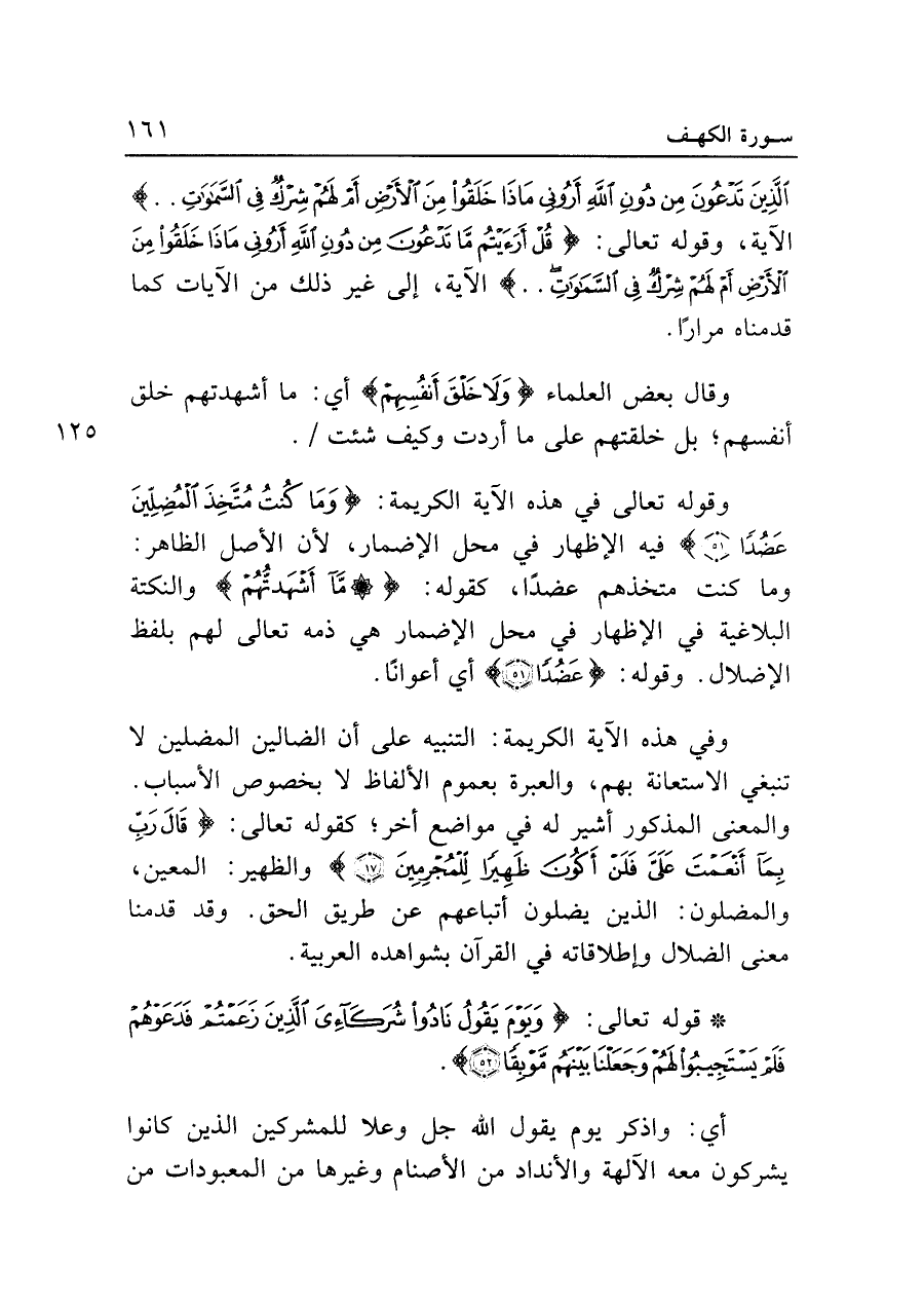 وقوله تعالى في هذه الآية الكريمة: {وَمَا كُنْتُ مُتَّخِذَ الْمُضِلِّينَ عَضُدًا (٥١)} فيه الإظهار في محل الإضمار، لأن الأصل الظاهر: وما كنت متخذهم عضدًا، كقوله: {مَا أَشْهَدْتُهُمْ} والنكتة البلاغية في الإظهار في محل الإضمار هي ذمه تعالى لهم بلفظ الإضلال. وقوله: {عَضُدًا (٥١)} أي أعوانًا.