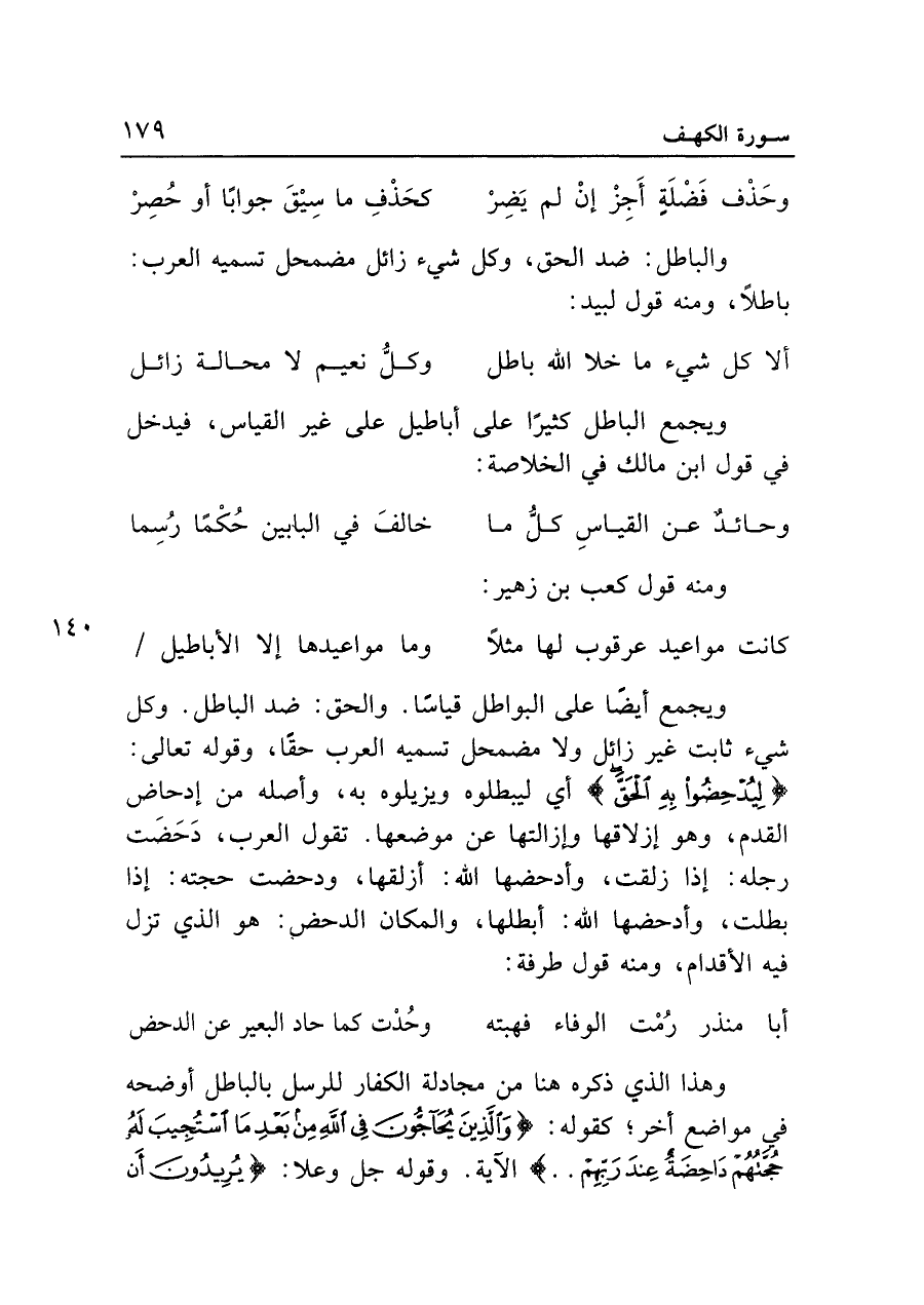 ويجمع أيضًا على البواطل قياسًا. والحق: ضد الباطل. وكل شيء ثابت غير زائل ولا مضمحل تسميه العرب حقًّا، وقوله تعالى: {لِيُدْحِضُوا بِهِ الْحَقَّ} أي ليبطلوه ويزيلوه به، وأصله من إدحاض القدم، وهو إزلاقها وإزالتها عن موضعها. تقول العرب، دحضت رجله: إذا زلقت، وأدحضها الله: أزلقها، ودحضت حجته: إذا بطلت، وأدحضها الله: أبطلها، والمكان الدحض: هو الذي تزل فيه الأقدام، ومنه قول طرفة: