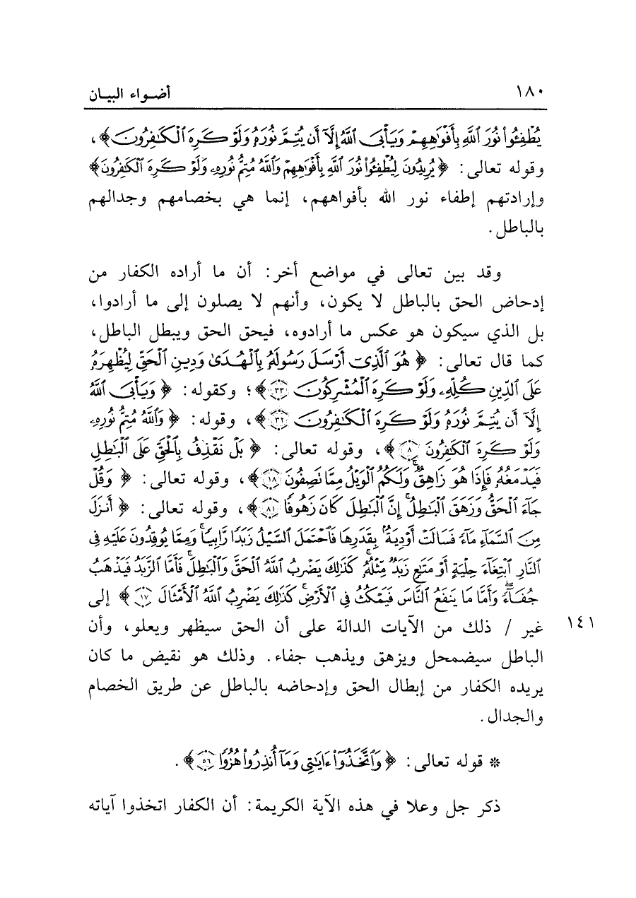 يُطْفِئُوا نُورَ اللَّهِ بِأَفْوَاهِهِمْ وَيَأْبَى اللَّهُ إلا أَنْ يُتِمَّ نُورَهُ وَلَوْ كَرِهَ الْكَافِرُونَ (٣٢)}، وقوله تعالى: {يُرِيدُونَ لِيُطْفِئُوا نُورَ اللَّهِ بِأَفْوَاهِهِمْ وَاللَّهُ مُتِمُّ نُورِهِ وَلَوْ كَرِهَ الْكَافِرُونَ (٨)} وإرادتهم إطفاء نور الله بأفواههم، إنما هي بخصامهم وجدالهم بالباطل.