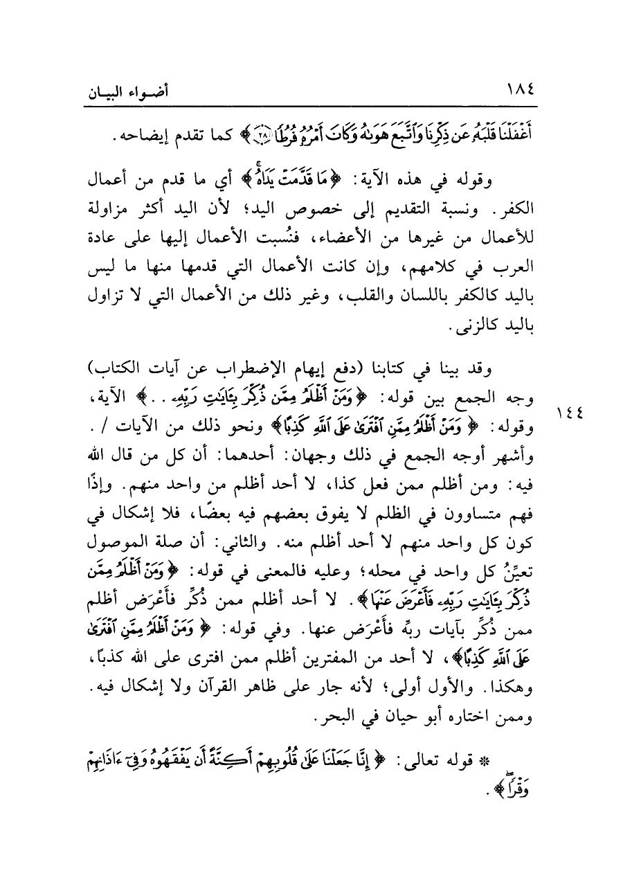 وقد بينا في كتابنا (دفع إيهام الإضطراب عن آيات الكتاب) وجه الجمع بين قوله: {وَمَنْ أَظْلَمُ مِمَّنْ ذُكِّرَ بِآيَاتِ رَبِّهِ ... } الآية، وقوله: {وَمَنْ أَظْلَمُ مِمَّنِ افْتَرَى عَلَى اللَّهِ كَذِبًا} ونحو ذلك من الآيات. وأشهر أوجه الجمع في ذلك وجهان: أحدهما: أن كل من قال الله فيه: ومن أظلم ممن فعل كذا، لا أحد أظلم من واحد منهم. وإذا فهم متساوون في الظلم لا يفوق بعضهم فيه بعضًا، فلا إشكال في كون كل واحد منهم لا أحد أظلم منه. والثاني: أن صلة الموصول تعيِّنُ كل واحد في محله، وعليه فالمعنى في قوله: {وَمَنْ أَظْلَمُ مِمَّنْ ذُكِّرَ بِآيَاتِ رَبِّهِ فَأَعْرَضَ عَنْهَا}. لا أحد أظلم ممن ذُكِّر فأعرض أظلم ممن ذُكِّر بآيات ربه فأعرض عنها. وفي قوله: {وَمَنْ أَظْلَمُ مِمَّنِ افْتَرَى عَلَى اللَّهِ كَذِبًا}، لا أحد من المفترين أظلم ممن افترى على الله كذبًا، وهكذا. والأول أولى؛ لأنه جار على ظاهر القرآن ولا إشكال فيه. وممن اختاره أبو حيان في البحر.