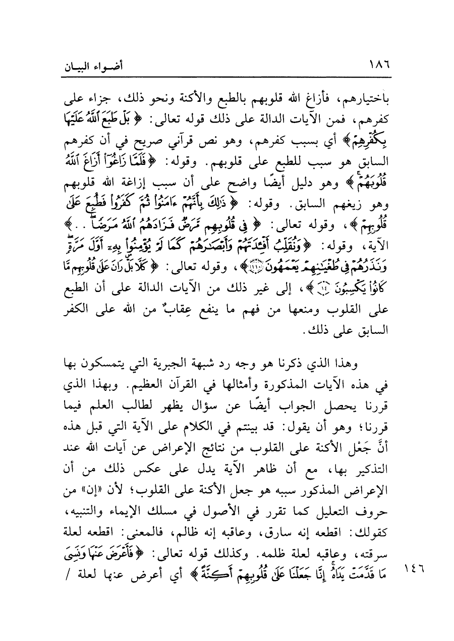 باختيارهم، فأزاغ الله قلوبهم بالطبع والأكنة ونحو ذلك، جزاء على كفرهم، فمن الآيات الدالة على ذلك قوله تعالى: {بَلْ طَبَعَ اللَّهُ عَلَيهَا بِكُفْرِهِمْ} أي بسبب كفرهم، وهو نص قرآني صريح في أن كفرهم السابق هو سبب للطبع على قلوبهم. وقوله: {فَلَمَّا زَاغُوا أَزَاغَ اللَّهُ قُلُوبَهُمْ} وهو دليل أيضًا واضح على أن سبب إزاغة الله قلوبهم وهو زيغهم السابق. وقوله. {ذَلِكَ بِأَنَّهُمْ آمَنُوا ثُمَّ كَفَرُوا فَطُبِعَ عَلَى قُلُوبِهِمْ ... }، وقوله تعالى: {فِي قُلُوبِهِمْ مَرَضٌ فَزَادَهُمُ اللَّهُ مَرَضًا ... } الآية، وقوله: {وَنُقَلِّبُ أَفْئِدَتَهُمْ وَأَبْصَارَهُمْ كَمَا لَمْ يُؤْمِنُوا بِهِ أَوَّلَ مَرَّةٍ وَنَذَرُهُمْ فِي طُغْيَانِهِمْ يَعْمَهُونَ (١١٠)}، وقوله تعالى: {كَلَّا بَلْ رَانَ عَلَى قُلُوبِهِمْ مَا كَانُوا يَكْسِبُونَ (١٤)}، إلى غير ذلك من الآيات الدالة على أن الطبع على القلوب ومنعها من فهم ما ينفع عِقابٌ من الله على الكفر السابق على ذلك.