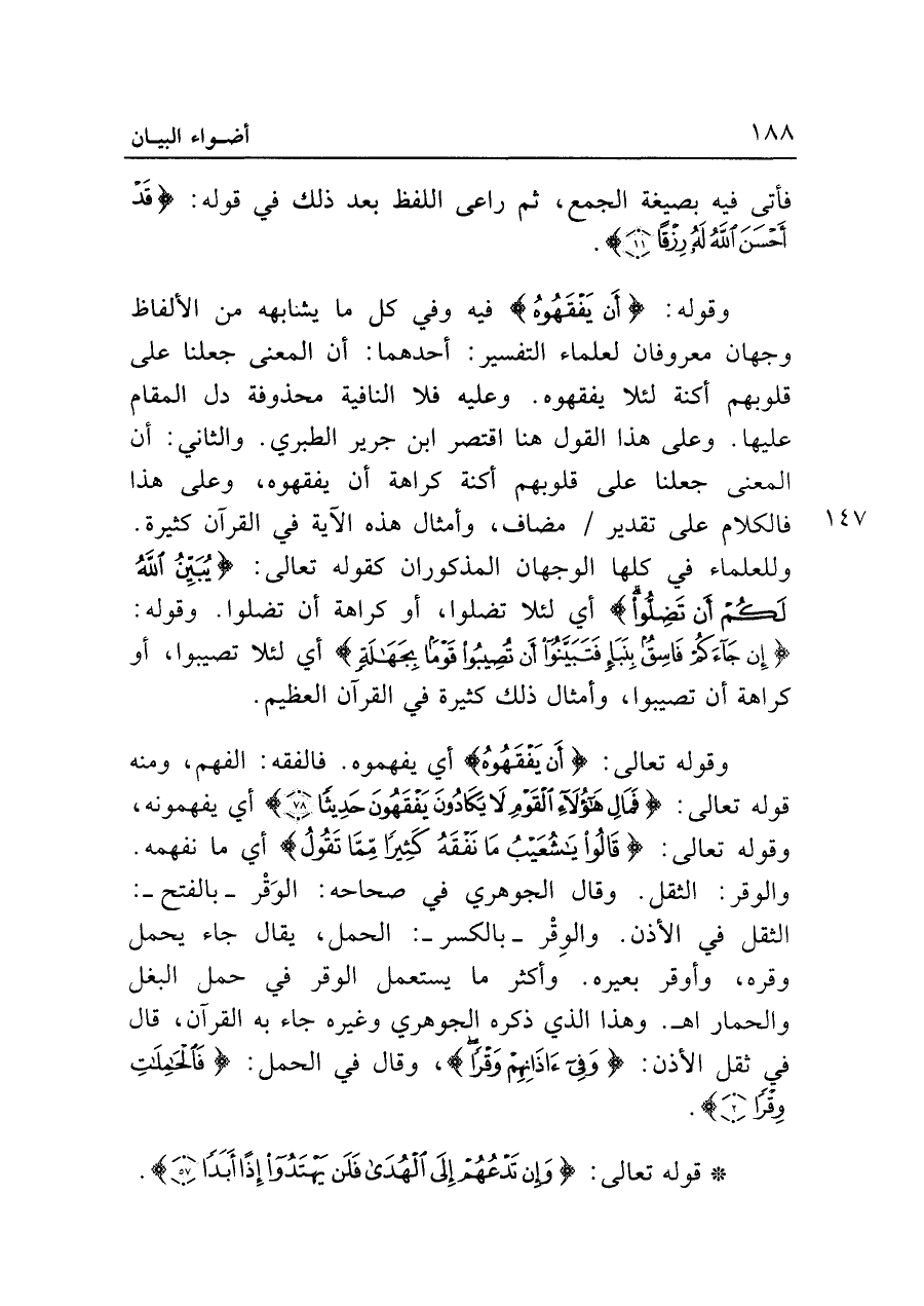 وقوله: {أَنْ يَفْقَهُوهُ} فيه وفي كل ما يشابهه من الألفاظ وجهان معروفان لعلماء التفسير: أحدهما: أن المعنى جعلنا على قلوبهم أكنة لئلا يفقهوه. وعليه فلا النافية محذوفة دل المقام عليها. وعلى هذا القول هنا اقتصر ابن جرير الطبري. والثاني: أن المعنى جعلنا على قلوبهم أكنة كراهة أن يفقهوه، وعلى هذا فالكلام على تقدير مضاف، وأمثال هذه الآية في القرآن كثيرة. وللعلماء في كلها الوجهان المذكوران كقوله تعالى: {يُبَيِّنُ اللَّهُ لَكُمْ أَنْ تَضِلُّوا} أي لئلا تضلوا، أو كراهة أن تضلوا. وقوله: {إِنْ جَاءَكُمْ فَاسِقٌ بِنَبَإ فَتَبَيَّنُوا أَنْ تُصِيبُوا قَوْمًا بِجَهَالةٍ}، أو كراهة أن تصيبوا، وأمثال ذلك كثيرة في القرآن العظيم.