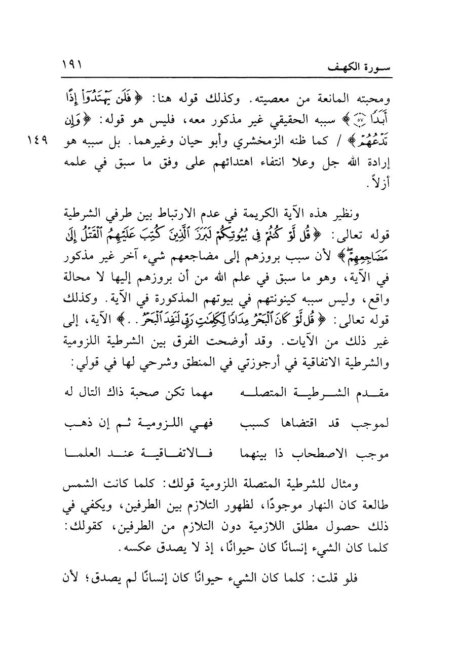 ونظير هذه الآية الكريمة في عدم الارتباط بين طرفي الشرطية قوله تعالى: {قُلْ لَوْ كُنْتُمْ فِي بُيُوتِكُمْ لَبَرَزَ الَّذِينَ كُتِبَ عَلَيهِمُ الْقَتْلُ إِلَى مَضَاجِعِهِمْ} لأن سبب بروزهم إلى مضاجعهم شيء آخر غير مذكور في الآية، وهو ما سبق في علم الله من أن بروزهم إليها لا محالة واقع، وليس سببه كينونتهم في بيوتهم المذكورة في الآية. وكذلك قوله تعالى: {قُلْ لَوْ كَانَ الْبَحْرُ مِدَادًا لِكَلِمَاتِ رَبِّي لَنَفِدَ الْبَحْرُ ... } الآية، إلى غير ذلك من الآيات. وقد أوضحت الفرق بين الشرطية اللزومية والشرطية الاتفاقية في أرجوزتي في المنطق وشرحي لها في قولي: