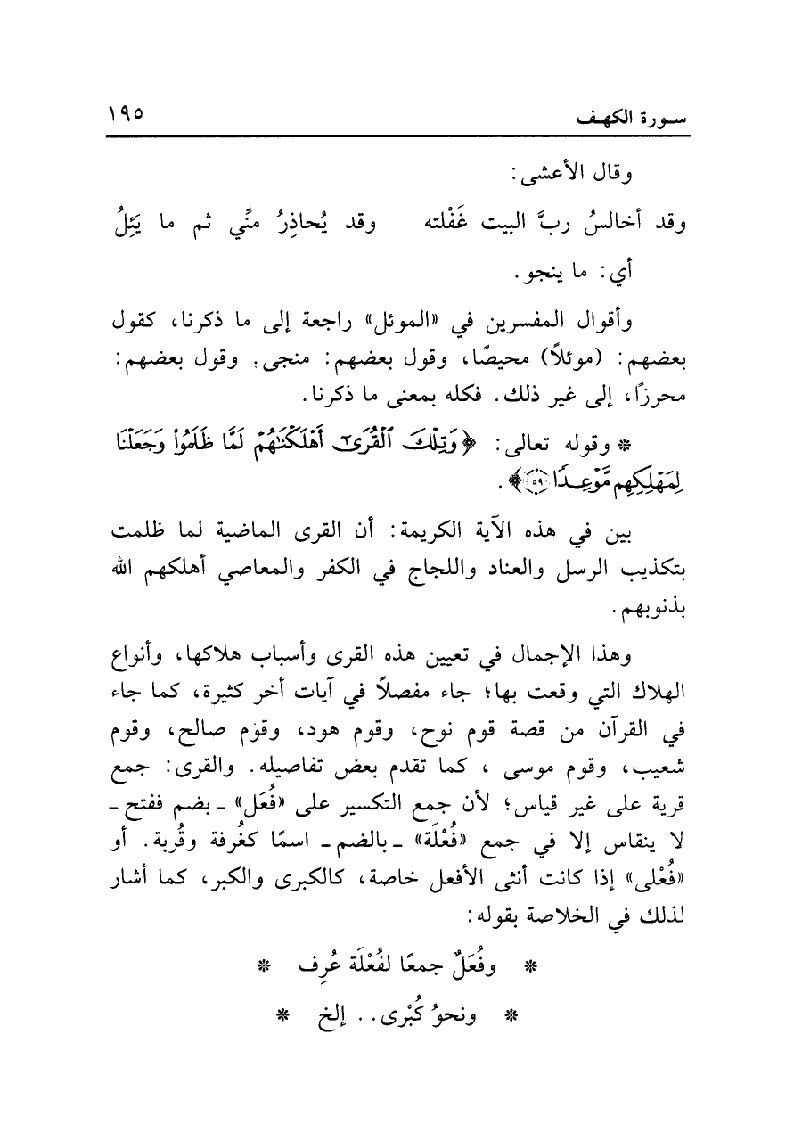 وهذا الإجمال في تعيين هذه القرى وأسباب هلاكها، وأنواع الهلاك التي وقعت بها؛ جاء مفصلًا في آيات أخر كثيرة، كما جاء في القرآن من قصة قوم نوح، وقوم هود، وقوم صالح، وقوم شعيب، وقوم موسى، كما تقدم بعض تفاصيله. والقرى: جمع قرية على غير قياس؛ لأن جمع التكسير على "فُعَل" -بضم ففتح- لا ينقاس إلا في جمع "فُعْلَة" -بالضم- اسمًا كغُرفة وقُربة. أو "فُعْلى" إذا كانت أنثى الأفعل خاصة، كالكبرى والكبر، كما أشار لذلك في الخلاصة بقوله: