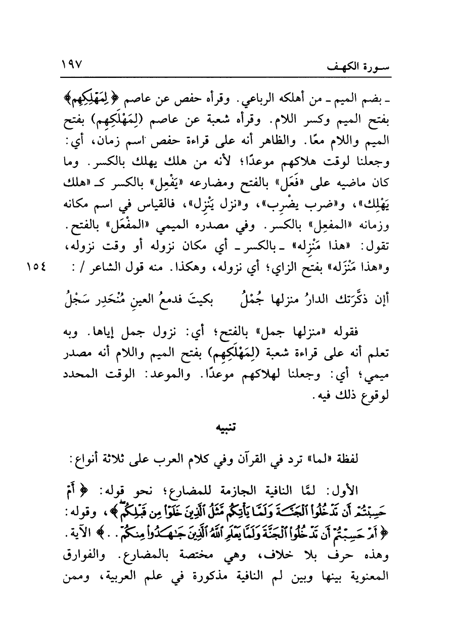 فقوله "منزلها جمل" بالفتح؛ أي: نزول جمل إياها. وبه تعلم أنه على قراءة شعبة (لِمَهْلَكِهِمْ) بفتح الميم واللام أنه مصدر ميمي؛ أي: وجعلنا لهلاكهم موعدًا. والموعد: الوقت المحدد لوقوع ذلك فيه.