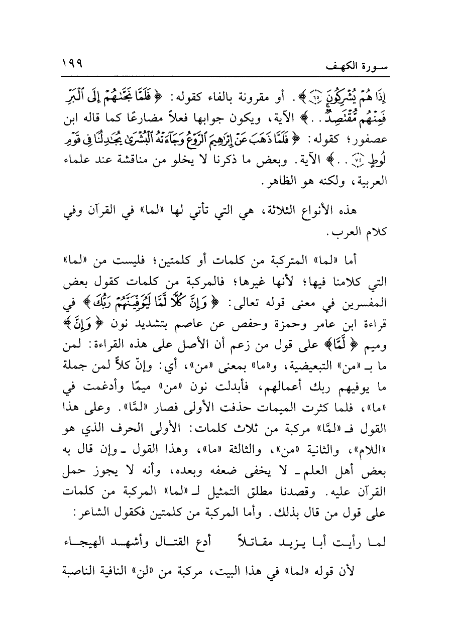 أما "لما" المتركبة من كلمات أو كلمتين، فليست من "لما" التي كلامنا فيها؛ لأنها غيرها، فالمركبة من كلمات كقول بعض المفسرين في معنى قوله تعالى: {وَإِنَّ كُلًّا لَمَّا لَيُوَفِّيَنَّهُمْ رَبُّكَ} في قراءة ابن عامر وحمزة وحفص عن عاصم بتشديد نون {وَإِنَّ} منه وميم {لَّمَّا} على قول من زعم أن الأصل على هذه القراءة: لمن ما بـ"من" التبعيضية، و"ما" بمعنى "من"، أي: وإن كلًّا لمن جملة ما يوفيهم ربك أعمالهم، فأبدلت نون "من" ميمًا وأدغمت في "ما"، فلما كثرت الميمات حذفت الأولى فصار "لما". وعلى هذا القول فـ"لمَّا" مركبة من ثلاث كلمات: الأولى الحرف الذي هو "اللام"، والثانية "من"، والثالثة "ما"، وهذا القول -وإن قال به بعض أهل العلم- لا يخفى ضعفه وبعده، وأنه لا يجوز حمل القرآن عليه. وقصدنا مطلق التمثيل لـ"لما" المركبة من كلمات على قول من قال بذلك. وأما المركبة من كلمتين فكقول الشاعر: