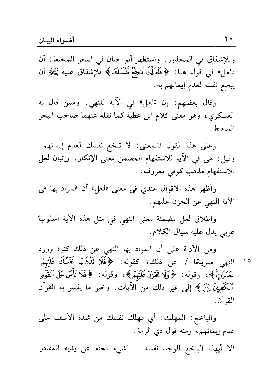 وأظهر هذه الأقوال عندي في معنى "لعل" أن المراد بها في الآية النهي عن الحزن عليهم.