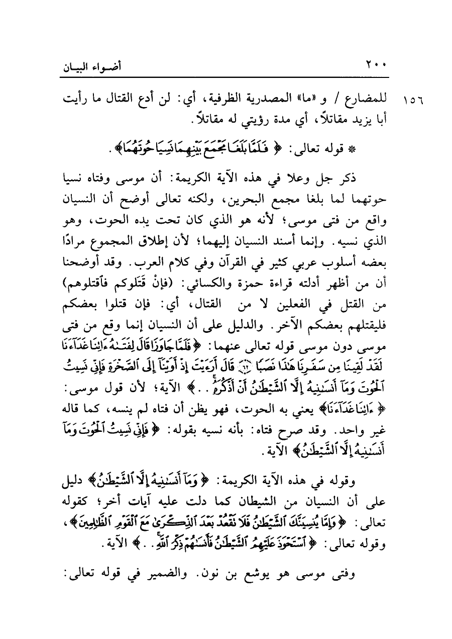 ذكر جل وعلا في هذه الآية الكريمة: أن موسى وفتاه نسيا حوتهما لما بلغا مجمع البحرين، ولكنه تعالى أوضح أن النسيان واقع من فتى موسى؛ لأنه هو الذي كان تحت يده الحوت، وهو الذي نسيه. وإنما أسند النسيان إليهما؛ لأن إطلاق المجموع مرادًا بعضه أسلوب عربي كثير في القرآن وفي كلام العرب. وقد أوضحنا أن من أظهر أدلته قراءة حمزة والكسائي: (فإنْ قَتَلوكم فاقتلوهم) من القتل في الفعلين لا من القتال، أي: فإن قتلوا بعضكم فليقتلهم بعضكم الآخر. والدليل على أن النسيان إنما وقع من فتى موسى دون موسى قوله تعالى عنهما: {فَلَمَّا جَاوَزَا قَالَ لِفَتَاهُ آتِنَا غَدَاءَنَا لَقَدْ لَقِينَا مِنْ سَفَرِنَا هَذَا نَصَبًا (٦٢) قَال أَرَأَيتَ إِذْ أَوَينَا إِلَى الصَّخْرَةِ فَإِنِّي نَسِيتُ الْحُوتَ وَمَا أَنْسَانِيهُ إلا الشَّيطَانُ أَنْ أَذْكُرَهُ .. } الآية؛ لأن قول موسى: {آتِنَا غَدَاءَنَا} يعني به الحوت، فهو يظن أن فتاه لم ينسه، كما قاله غير واحد. وقد صرح فتاه: بأنه نسيه بقوله: {فَإِنِّي نَسِيتُ الْحُوتَ وَمَا أَنْسَانِيهُ إلا الشَّيطَانُ} الآية.
