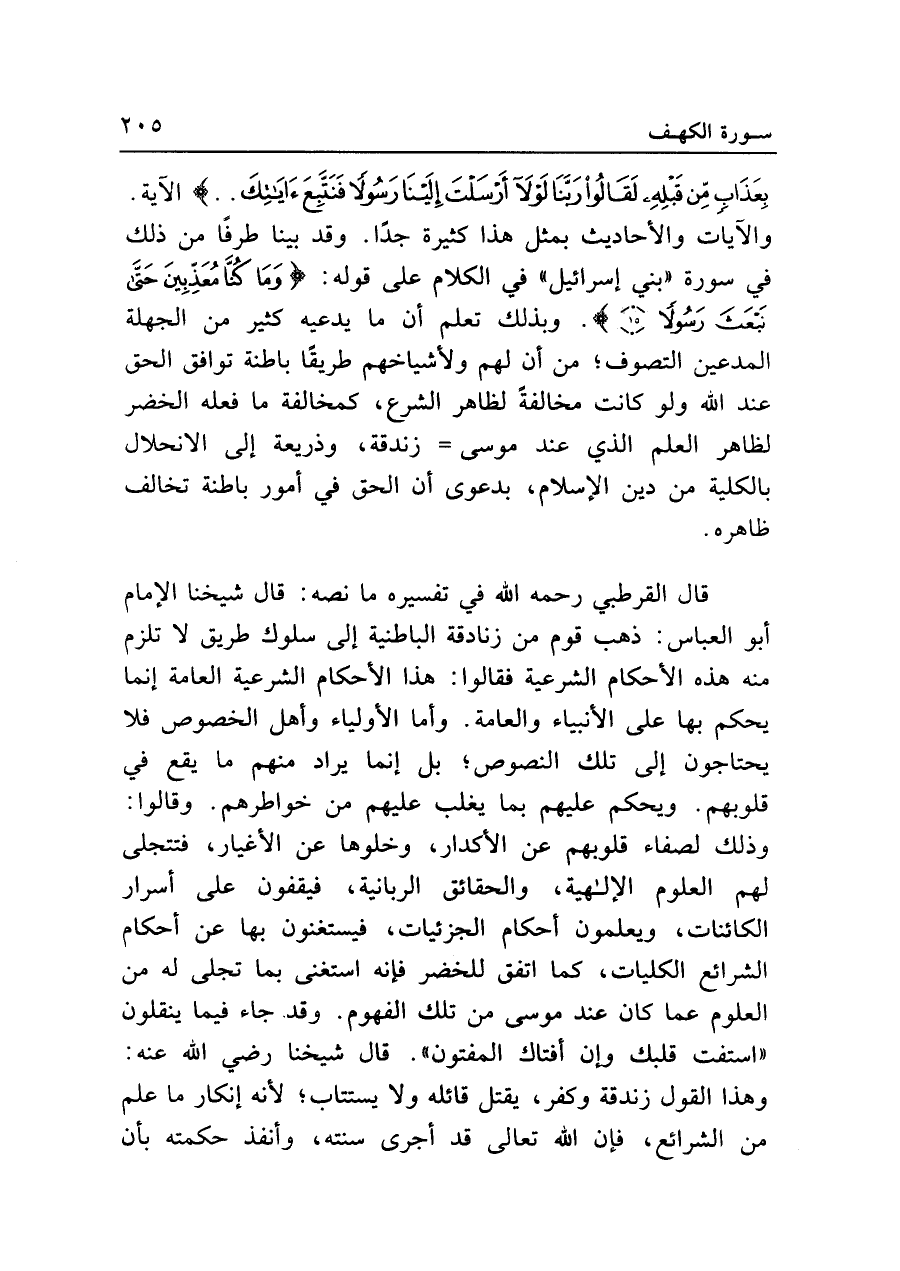 قال القرطبي رحمه الله في تفسيره ما نصه: قال شيخنا الإمام أبو العباس: ذهب قوم من زنادقة الباطنية إلى سلوك طريق لا تلزم منه هذه الأحكام الشرعية فقالوا: هذا الأحكام الشرعية العامة إنما يحكم بها على الأنبياء والعامة. وأما الأولياء وأهل الخصوص فلا يحتاجون إلى تلك النصوص؛ بل إنما يراد منهم ما يقع في قلوبهم. ويحكم عليهم بما يغلب عليهم من خواطرهم. وقالوا: وذلك لصفاء قلوبهم عن الأكدار، وخلوها عن الأغيار، فتتجلى لهم العلوم الإلهية، والحقائق الربانية، فيقفون على أسرار الكائنات، ويعلمون أحكام الجزئيات، فيستغنون بها عن أحكام الشرائع الكليات، كما اتفق للخضر فإنه استغنى بما تجلى له من العلوم عما كان عند موسى من تلك الفهوم. وقد جاء فيما ينقلون "استفت قلبك وإن أفتاك المفتون". قال شيخنا رضي الله عنه: وهذا القول زندقة وكفر، يقتل قائله ولا يستتاب؛ لأنه إنكار ما علم من الشرائع، فإن الله تعالى قد أجرى سنته، وأنفذ حكمته بأن