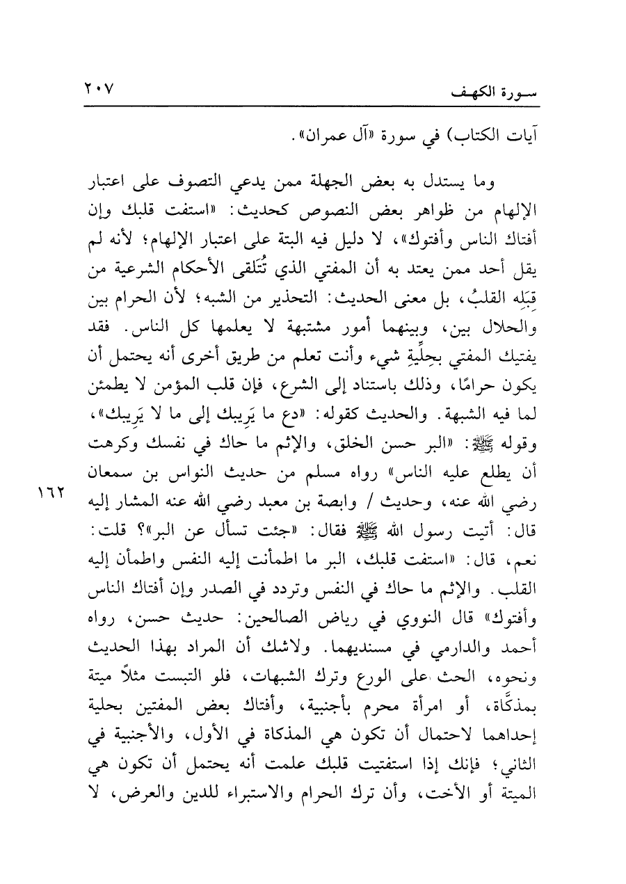 وما يستدل به بعض الجهلة ممن يدعي التصوف على اعتبار الإلهام من ظواهر بعض النصوص كحديث: "استفت قلبك وإن أفتاك الناس وأفتوك"، لا دليل فيه البتة على اعتبار الإلهام؛ لأنه لم يقل أحد ممن يعتد به أن المفتي الذي تتلقى الأحكام الشرعية من قبله القلب، بل معنى الحديث: التحذير من الشبه؛ لأن الحرام بين والحلال بين، وبينهما أمور مشتبهة لا يعلمها كل الناس. فقد يفتيك المفتي بحِلِّيةِ شيء وأنت تعلم من طريق آخر أنه يحتمل أن يكون حرامًا، وذلك باستناد إلى الشرع، فإن قلب المؤمن لا يطمئن لما فيه الشبهة. والحديث كقوله: "دع ما يَرِيبك إلى ما لا يَريبك"، وقوله - صلى الله عليه وسلم - : "البر حسن الخلق، والإثم ما حاك في نفسك وكرهت أن يطلع عليه الناس" رواه مسلم من حديث النواس بن سمعان رضي الله عنه، وحديث وابصة بن معبد رضي الله عنه المشار إليه قال: أتيت رسول الله - صلى الله عليه وسلم - فقال: "جئت تسأل عن البر"؟ قلت: نعم، قال: "استفت قلبك، البر ما اطمأنت إليه النفس واطمأن إليه القلب. والإثم ما حاك في النفس وتردد في الصدر وإن أفتاك الناس وأفتوك" قال النووي في رياض الصالحين: حديث حسن، رواه أحمد والدارمي في مسنديهما. ولا شك أن المراد بهذا الحديث ونحوه، الحث على الورع وترك الشبهات، فلو التبست مثلًا ميتة بمذكَّاة، أو امرأة محرم بأجنبية، وأفتاك بعض المفتين بحلية إحداهما لاحتمال أن تكون هي المذكاة في الأول، والأجنبية في الثاني؛ فإنك إذا استفتيت قلبك علمت أنه يحتمل أن تكون هي الميتة أو الأخت، وأن ترك الحرام والاستبراء للدين والعرض، لا