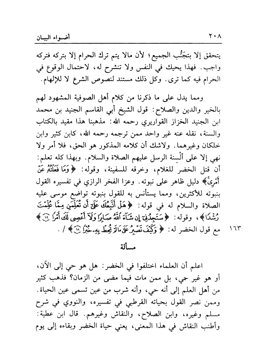 ومما يدل على ما ذكرنا من كلام أهل الصوفية المشهود لهم بالخير والدين والصلاح: قول الشيخ أبي القاسم الجنيد بن محمد بن الجنيد الخزاز القواريري رحمه الله: مذهبنا هذا مقيد بالكتاب والسنة، نقله عنه غير واحد ممن ترجمه رحمه الله، كابن كثير وابن خلكان وغيرهما. ولا شك أن كلامه المذكور هو الحق، فلا أمر ولا نهي إلا على ألسنة الرسل عليهم الصلاة والسلام. وبهذا كله تعلم: أن قتل الخضر للغلام، وخرقه للسفينة، وقوله: {وَمَا فَعَلْتُهُ عَنْ أَمْرِي} دليل ظاهر على نبوته. وعزا الفخر الرازي في تفسيره القول بنبوته للأكثرين، ومما يستأنس به للقول بنبوته تواضع موسى عليه الصلاة والسلام له في قوله: {هَلْ أَتَّبِعُكَ عَلَى أَنْ تُعَلِّمَنِ مِمَّا عُلِّمْتَ رُشْدًا (٦٦)}، وقوله: {سَتَجِدُنِي إِنْ شَاءَ اللَّهُ صَابِرًا وَلَا أَعْصِي لَكَ أَمْرًا (٦٩)} مع قول الخضر له: {وَكَيفَ تَصْبِرُ عَلَى مَا لَمْ تُحِطْ بِهِ خُبْرًا (٦٨)}.