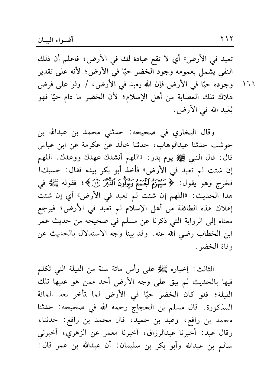 تعبد في الأرض" أي لا تقع عبادة لك في الأرض؛ فاعلم أن ذلك النفي يشمل بعمومه وجود الخضر حيًّا في الأرض؛ لأنه على تقدير وجوده حيًّا في الأرض فإن الله يعبد في الأرض، ولو على فرض هلاك تلك العصابة من أهل الإسلام؛ لأن الخضر مادام حيًّا فهو يعبد الله في الأرض.
