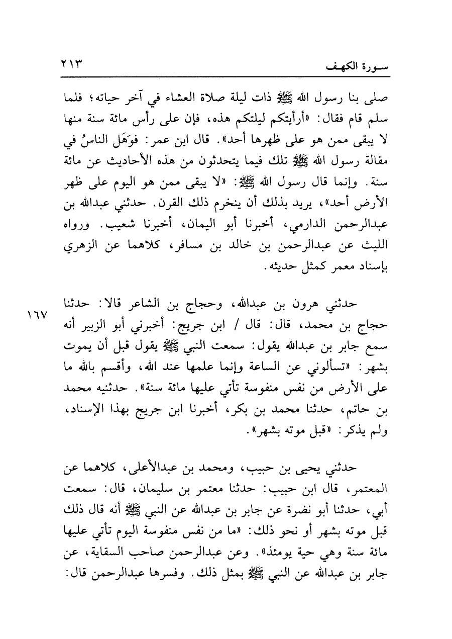 حدثني يحيى بن حبيب، ومحمد بن عبد الأعلى، كلاهما عن المعتمر، قال ابن حبيب: حدثنا معتمر بن سليمان، قال: سمعت أبي، حدثنا أبو نضرة عن جابر بن عبد الله عن النبي - صلى الله عليه وسلم - أنه قال ذلك قبل موته بشهر أو نحو ذلك: "ما من نفس منفوسة اليوم تأتي عليها مائة سنة وهي حية يومئذ". وعن عبد الرحمن صاحب السقاية، عن جابر بن عبد الله عن النبي - صلى الله عليه وسلم - بمثل ذلك. وفسرها عبد الرحمن قال: