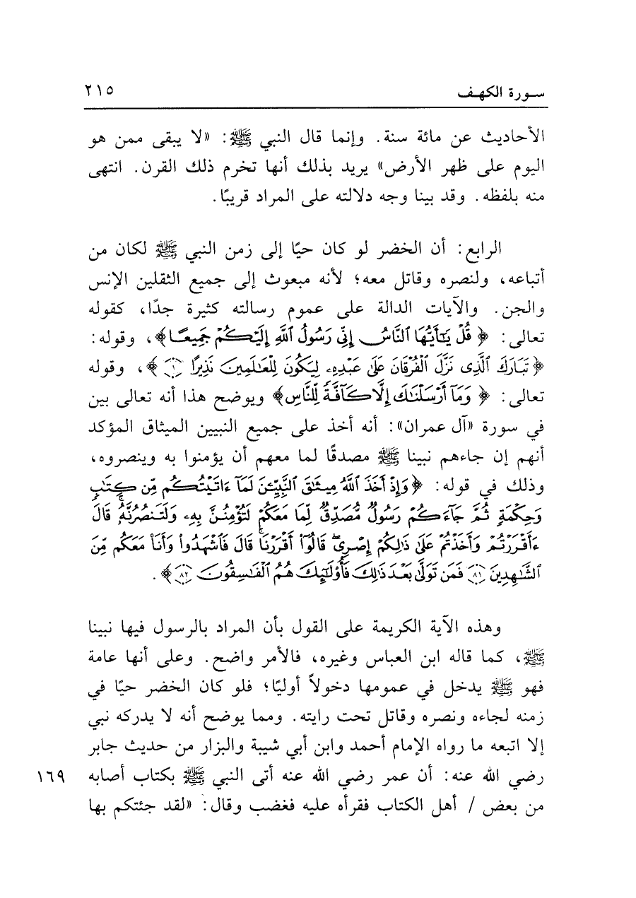 الرابع: أن الخضر لو كان حيًّا إلى زمن النبي - صلى الله عليه وسلم - لكان من أتباعه، ولنصره وقاتل معه؛ لأنه مبعوث إلى جميع الثقلين الإنس والجن. والآيات الدالة على عموم رسالته كثيرة جدًا، كقوله تعالى: {قُلْ يَا أَيُّهَا النَّاسُ إِنِّي رَسُولُ اللَّهِ إِلَيكُمْ جَمِيعًا}، وقوله: {تَبَارَكَ الَّذِي نَزَّلَ الْفُرْقَانَ عَلَى عَبْدِهِ لِيَكُونَ لِلْعَالمِينَ نَذِيرًا (١)}، وقوله تعالى: {وَمَا أَرْسَلْنَاكَ إلا كَافَّةً لِلنَّاسِ} ويوضح هذا أنه تعالى بين في سورة "آل عمران": أنه أخذ على جميع النبيين الميثاق المؤكد أنهم إن جاءهم نبينا - صلى الله عليه وسلم - مصدقًا لما معهم أن يؤمنوا به وينصروه، وذلك في قوله: {وَإِذْ أَخَذَ اللَّهُ مِيثَاقَ النَّبِيِّينَ لَمَا آتَيتُكُمْ مِنْ كِتَابٍ وَحِكْمَةٍ ثُمَّ جَاءَكُمْ رَسُولٌ مُصَدِّقٌ لِمَا مَعَكُمْ لَتُؤْمِنُنَّ بِهِ وَلَتَنْصُرُنَّهُ قَال أَأَقْرَرْتُمْ وَأَخَذْتُمْ عَلَى ذَلِكُمْ إِصْرِي قَالُوا أَقْرَرْنَا قَال فَاشْهَدُوا وَأَنَا مَعَكُمْ مِنَ الشَّاهِدِينَ (٨١) فَمَنْ تَوَلَّى بَعْدَ ذَلِكَ فَأُولَئِكَ هُمُ الْفَاسِقُونَ (٨٢)}.