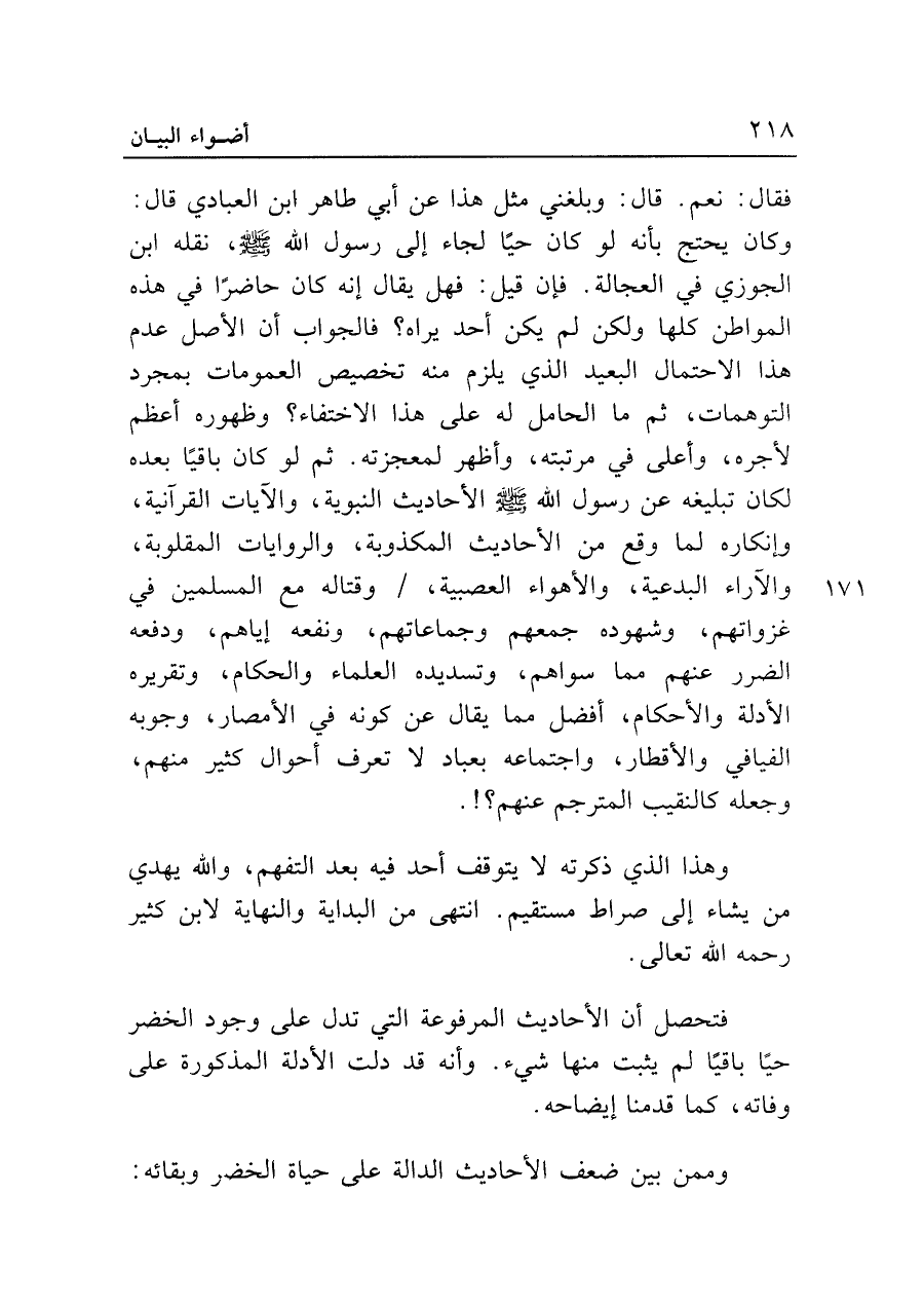 فقال: نعم. قال: وبلغني مثل هذا عن أبي طاهر بن العبادي قال: وكان يحتج بأنه لو كان حيًا لجاء إلى رسول الله - صلى الله عليه وسلم -، نقله ابن الجوزي في العجالة. فإن قيل: فهل يقال إنه كان حاضرًا في هذه المواطن كلها ولكن لم يكن أحد يراه؟ فالجواب أن الأصل عدم هذا الاحتمال البعيد الذي يلزم منه تخصيص العمومات بمجرد التوهمات، ثم ما الحامل له على هذا الاختفاء؟ وظهوره أعظم لأجره، وأعلى في مرتبته، وأظهر لمعجزته. ثم لو كان باقيًا بعده لكان تبليغه عن رسول الله - صلى الله عليه وسلم - الأحاديث النبوية، والآيات القرآنية، وإنكاره لما وقع من الأحاديث المكذوبة، والروايات المقلوبة، والآراء البدعية، والأهواء العصبية، وقتاله مع المسلمين في غزواتهم، وشهوده جمعهم وجماعاتهم، ونفعه إياهم، ودفعه الضرر عنهم مما سواهم، وتسديده العلماء والحكام، وتقريره الأدلة والأحكام، أفضل مما يقال عن كونه في الأمصار، وجوبه الفيافي والأقطار، واجتماعه بعباد لا تعرف أحوال كثير منهم، وجعله كالنقيب المترجم عنهم؟!.