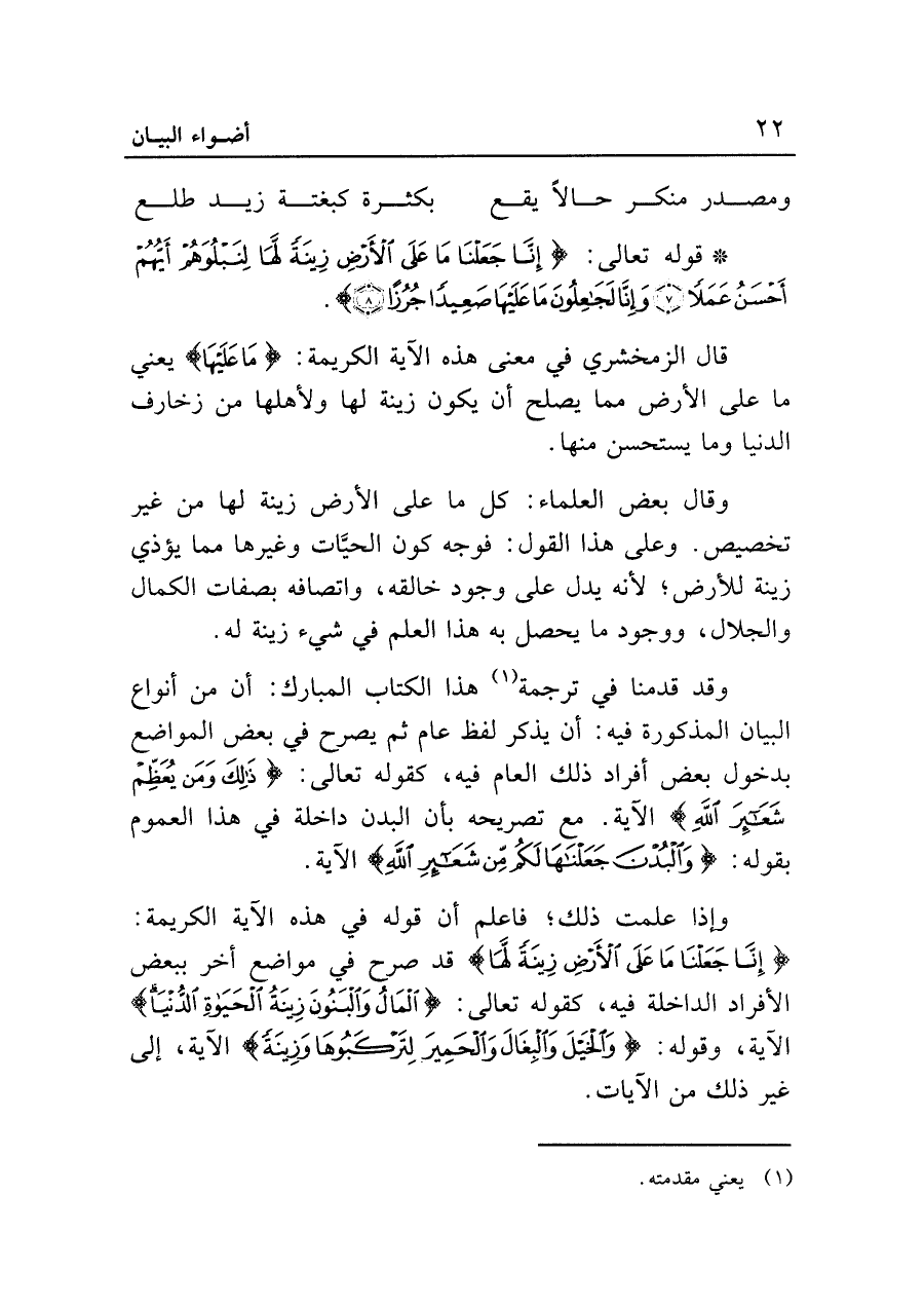 وإذا علمت ذلك؛ فاعلم أن قوله في هذة الآية الكريمة: {إِنَّا جَعَلْنَا مَا عَلَى الْأَرْضِ زِينَةً لَهَا} قد صرح في مواضع أخر ببعض الأفراد الداخلة فيه، كقوله تعالى: {الْمَالُ وَالْبَنُونَ زِينَةُ الْحَيَاةِ الدُّنْيَا} الآية، وقوله: {وَالْخَيْلَ وَالْبِغَالَ وَالْحَمِيرَ لِتَرْكَبُوهَا وَزِينَةً} الآية، إلى غير ذلك من الآيات.