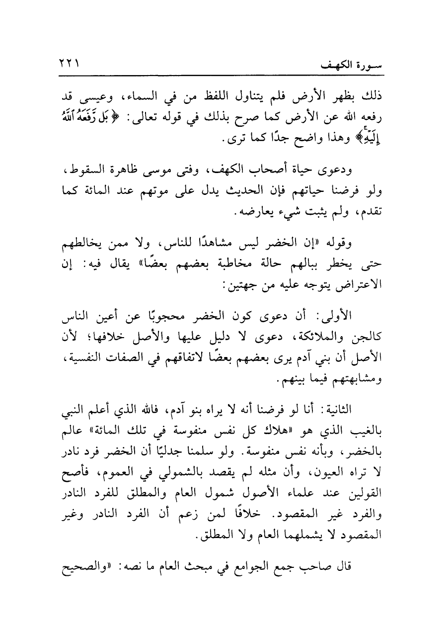 وقوله "إن الخضر ليس مشاهدًا للناس، ولا ممن يخالطهم حتى يخطر ببالهم حالة مخاطبة بعضهم بعضًا" يقال فيه: إن الاعتراض يتوجه عليه من جهتين: