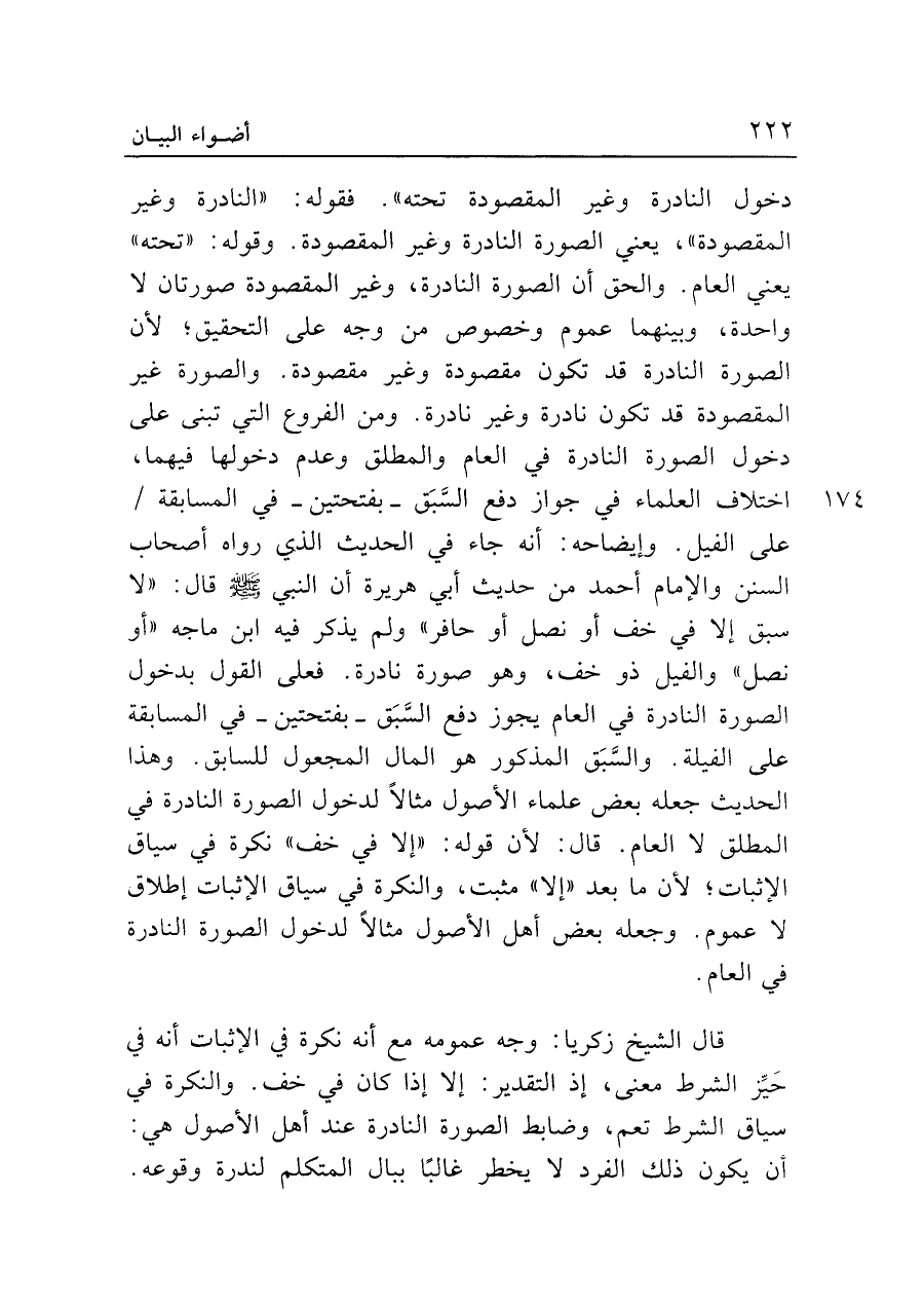دخول النادرة وغير المقصودة تحته". فقوله: "النادرة وغير المقصودة"، يعني الصورة النادرة وغير المقصودة. وقوله: "تحته" يعني العام. والحق أن الصورة النادرة، وغير المقصودة صورتان لا واحدة، وبينهما عموم وخصوص من وجه على التحقيق؛ لأن الصورة النادرة قد تكون مقصودة وغير مقصودة. والصورة غير المقصودة قد تكون نادرة وغير نادرة. ومن الفروع التي تبنى على دخول الصورة النادرة في العام والمطلق وعدم دخولها فيهما، اختلاف العلماء في جواز دفع السَّبَق -بفتحتين- في المسابقة على الفيل. وإيضاحه: أنه جاء في الحديث الذي رواه أصحاب السنن والإمام أحمد من حديث أبي هريرة أن النبي - صلى الله عليه وسلم - قال: "لا سبق إلا في خف أو نصل أو حافر" ولم يذكر فيه ابن ماجه "أو نصل" والفيل ذو خف، وهو صورة نادرة. فعلى القول بدخول الصورة النادرة في العام يجوز دفع السَّبَق -بفتحتين- في المسابقة على الفيلة. والسَّبَق المذكور هو المال المجعول للسابق. وهذا الحديث جعله بعض علماء الأصول مثالًا لدخول الصورة النادرة في المطلق لا العام. قال: لأن قوله: "إلا في خف" نكرة في سياق الإثبات؛ لأن ما بعد "إلا" مثبت، والنكرة في سياق الإثبات إطلاق لا عموم. وجعله بعض أهل الأصول مثالًا لدخول الصورة النادرة في العام.