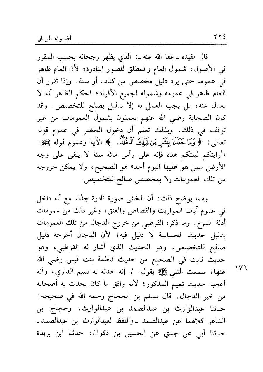 ومما يوضح ذلك: أن الخنثى صورة نادرة جدًّا، مع أنه داخل في عموم آيات المواريث والقصاص والعتق، وغير ذلك من عمومات أدلة الشرع. وما ذكره القرطبي من خروج الدجال من تلك العمومات بدليل حديث الجساسة لا دليل فيه؛ لأن الدجال أخرجه دليلَ صالح للتخصيص، وهو الحديث الذي أشار له القرطبي، وهو حديث ثابت في الصحيح من حديث فاطمة بنت قيس رضي الله عنها، سمعت النبي - صلى الله عليه وسلم - يقول: إنه حدثه به تميم الداري، وأنه أعجبه حديث تميم المذكور؛ لأنه وافق ما كان يحدث به أصحابه من خبر الدجال. قال مسلم بن الحجاج رحمه الله في صحيحه: حدثنا عبد الوارث بن عبد الصمد بن عبد الوارث، وحجاج بن الشاعر كلاهما عن عبد الصمد -واللفظ لعبد الوارث بن عبد الصمد- حدثنا أبي عن جدي عن الحسين بن ذكوان، حدثنا ابن بريدة