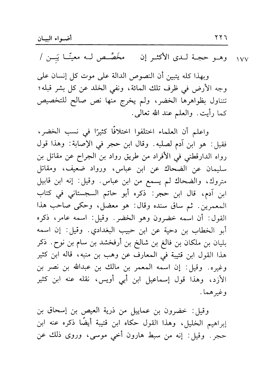 واعلم أن العلماء اختلفوا اختلافًا كثيرًا في نسب الخضر، فقيل: هو ابن آدم لصلبه. وقال ابن حجر في الإصابة: وهذا قول رواه الدارقطني في الأفراد من طريق رواد بن الجراح عن مقاتل بن سليمان عن الضحاك عن ابن عباس، ورواد ضعيف، ومقاتل متروك، والضحاك لم يسمع من ابن عباس. وقيل: إنه ابن قابيل ابن آدم، قال ابن حجر: ذكره أبو حاتم السجستاني في كتاب المعمرين. ثم ساق سنده وقال: هو معضل، وحكى صاحب هذا القول: أن اسمه خضرون وهو الخضر. وقيل: اسمه عامر، ذكره أبو الخطاب بن دحية عن ابن حبيب البغدادي. وقيل: إن اسمه بليان بن ملكان بن فالغ بن شالخ بن أرفخشد بن سام بن نوح. ذكر هذا القول ابن قتيبة في المعارف عن وهب بن منبه، قاله ابن كثير وغيره. وقيل: إن اسمه المعمر بن مالك بن عبد الله بن نصر بن الأزد، وهذا قول إسماعيل بن أبي أويس، نقله عنه ابن كثير وغيرهما.