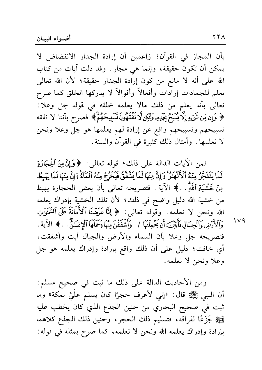 ومن الأحاديث الدالة على ذلك ما ثبت في صحيح مسلم: أن النبي - صلى الله عليه وسلم - قال: "إني لأعرف حجرًا كان يسلم علَيَّ بمكة" وما ثبت في صحيح البخاري من حنين الجذع الذي كان يخطب عليه - صلى الله عليه وسلم - جَزَعًا لفراقه، فتسليم ذلك الحجر، وحنين ذلك الجذع كلاهما بإرادة وإدراك يعلمه الله ونحن لا نعلمه، كما صرح بمثله في قوله: