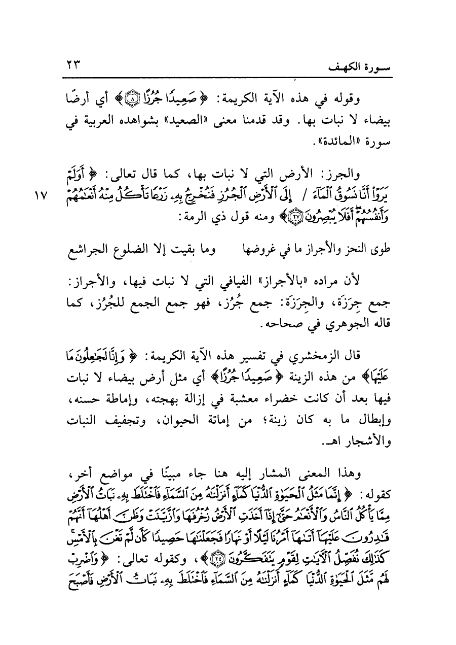 وقوله في هذه الآية الكريمة: {صَعِيدًا جُرُزًا (٨)} أي أرضًا بيضاء لا نبات بها. وقد قدمنا معنى "الصعيد" بشواهده العربية في سورة "المائدة".