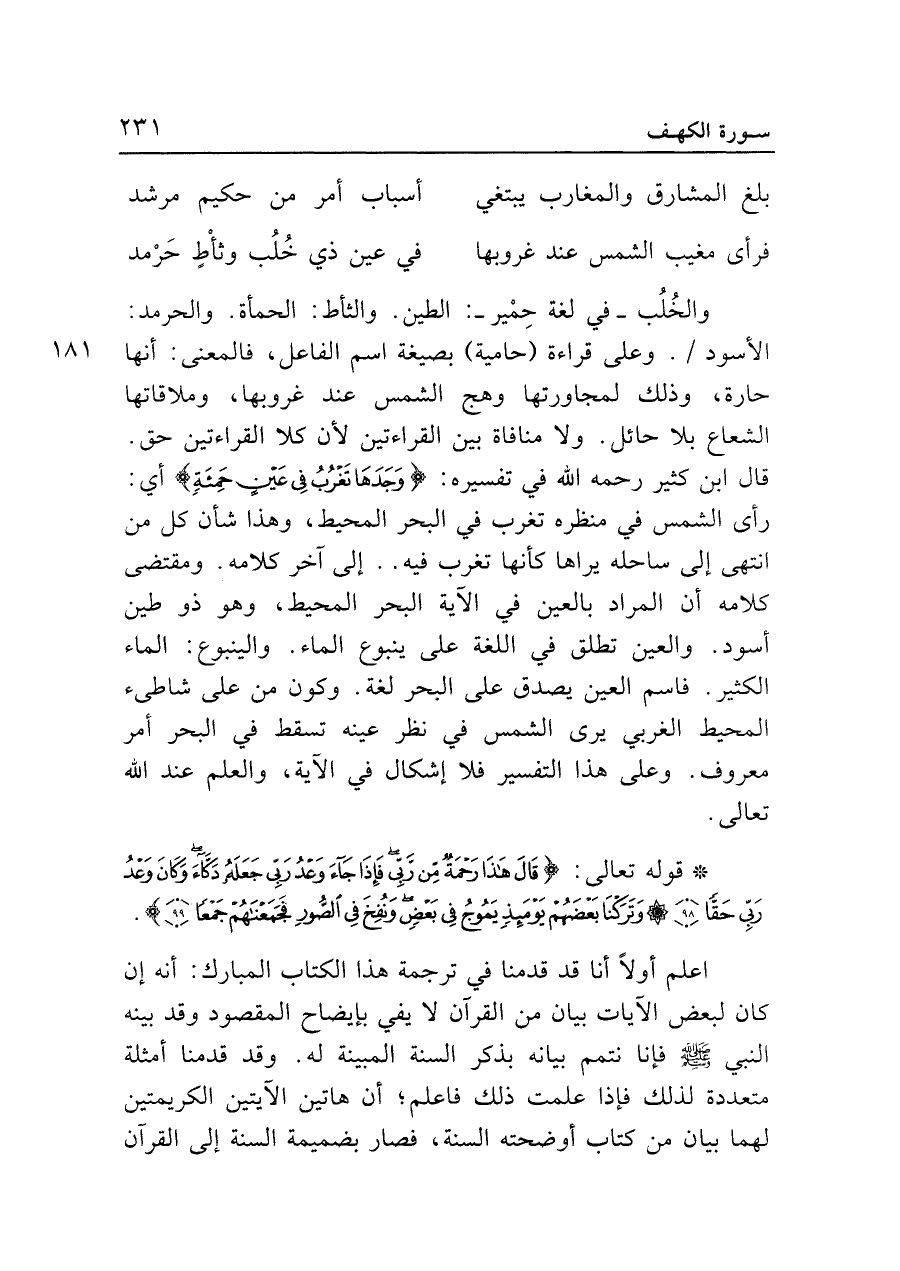 والخُلُب -في لغة حِمْير-: الطين. والثأط: الحمأة. والحرمد: الأسود. وعلى قراءة (حامية) بصيغة اسم الفاعل، فالمعنى: أنها حارة، وذلك لمجاورتها وهج الشمس عند غروبها، وملاقاتها الشعاع بلا حائل. ولا منافاة بين القراءتين لأن كلا القراءتين حق. قال ابن كثير رحمه الله في تفسيره: {وَجَدَهَا تَغْرُبُ فِي عَينٍ حَمِئَةٍ} أي: رأى الشمس في منظره تغرب في البحر المحيط، وهذا شأن كل من انتهى إلى ساحله يراها كأنها تغرب فيه. . إلى آخر كلامه. ومقتضى كلامه أن المراد بالعين في الآية البحر المحيط، وهو ذو طين أسود. والعين تطلق في اللغة على ينبوع الماء. والينبوع: الماء الكثير. فاسم العين يصدق على البحر لغة. وكون من على شاطئ المحيط الغربي يرى الشمس في نظر عينه تسقط في البحر أمر معروف. وعلى هذا التفسير فلا إشكال في الآية، والعلم عند الله تعالى.