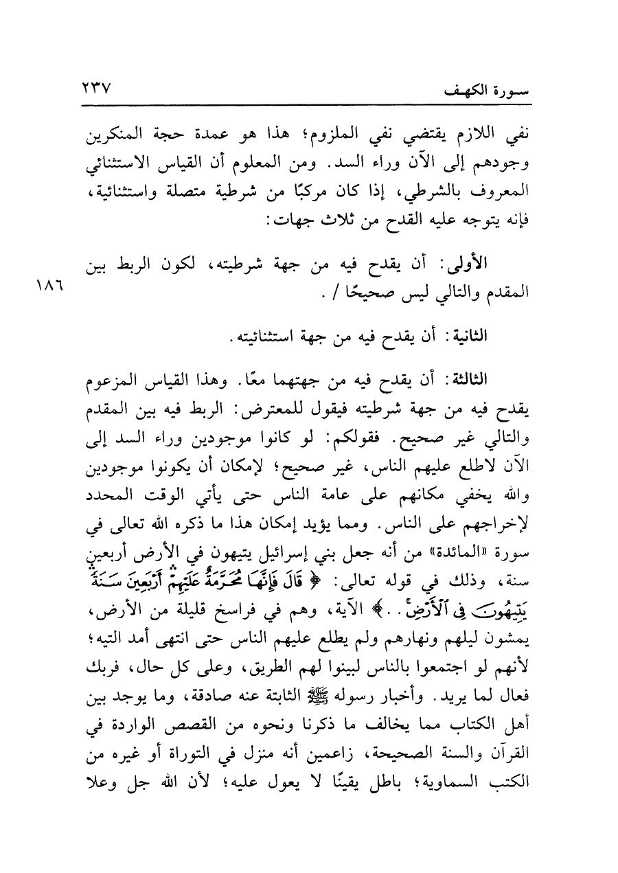 الثالثة: أن يقدح فيه من جهتهما معًا. وهذا القياس المزعوم يقدح فيه من جهة شرطيته فيقول للمعترض: الربط فيه بين المقدم والتالي غير صحيح. فقولكم: لو كانوا موجودين وراء السد إلى الآن لاطلع عليهم الناس، غير صحيح؛ لإمكان أن يكونوا موجودين والله يخفي مكانهم على عامة الناس حتى يأتي الوقت المحدد لإخراجهم على الناس. ومما يؤيد إمكان هذا ما ذكره الله تعالى في سورة "المائدة" من أنه جعل بني إسرائيل يتيهون في الأرض أربعين سنة، وذلك في قوله تعالى: {قَال فَإِنَّهَا مُحَرَّمَةٌ عَلَيهِمْ أَرْبَعِينَ سَنَةً يَتِيهُونَ فِي الْأَرْضِ ..} الآية، وهم في فراسخ قليلة من الأرض، يمشون ليلهم ونهارهم ولم يطلع عليهم الناس حتى انتهى أمد التيه؛ لأنهم لو اجتمعوا بالناس لبينوا لهم الطريق، وعلى كل حال، فربك فعال لما يريد. وأخبار رسوله - صلى الله عليه وسلم - الثابتة عنه صادقة، وما يوجد بين أهل الكتاب مما يخالف ما ذكرنا ونحوه من القصص الواردة في القرآن والسنة الصحيحة، زاعمين أنه منزل في التوراة أو غيره من الكتب السماوية؛ باطل يقينًا لا يعول عليه؛ لأن الله جل وعلا