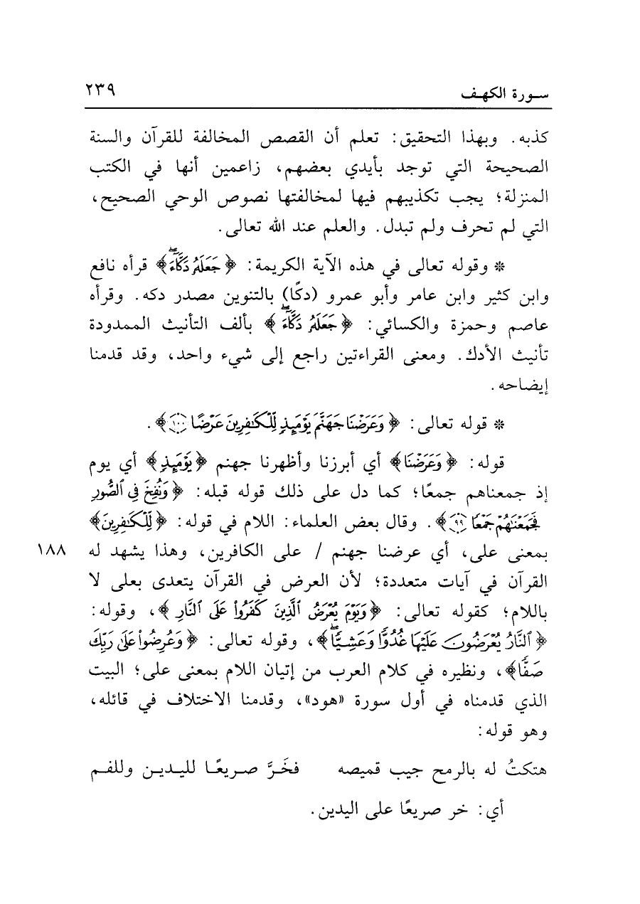 • قوله تعالى: {وَعَرَضْنَا جَهَنَّمَ يَوْمَئِذٍ لِلْكَافِرِينَ عَرْضًا (١٠٠)}.